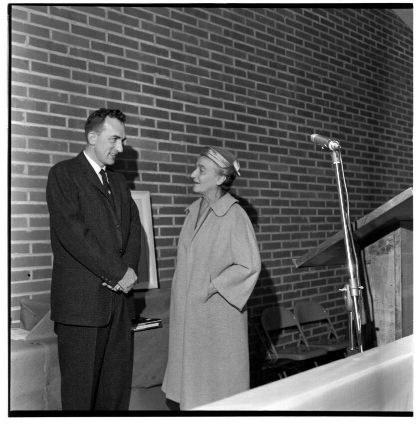 Negative, sheet film. 2 x 2 b&w. Dedication of Peter G. Schmidt Elementary School in Tumwater. Principal Jim Pill and Clara Schmidt (widow of Peter G. Schmidt)