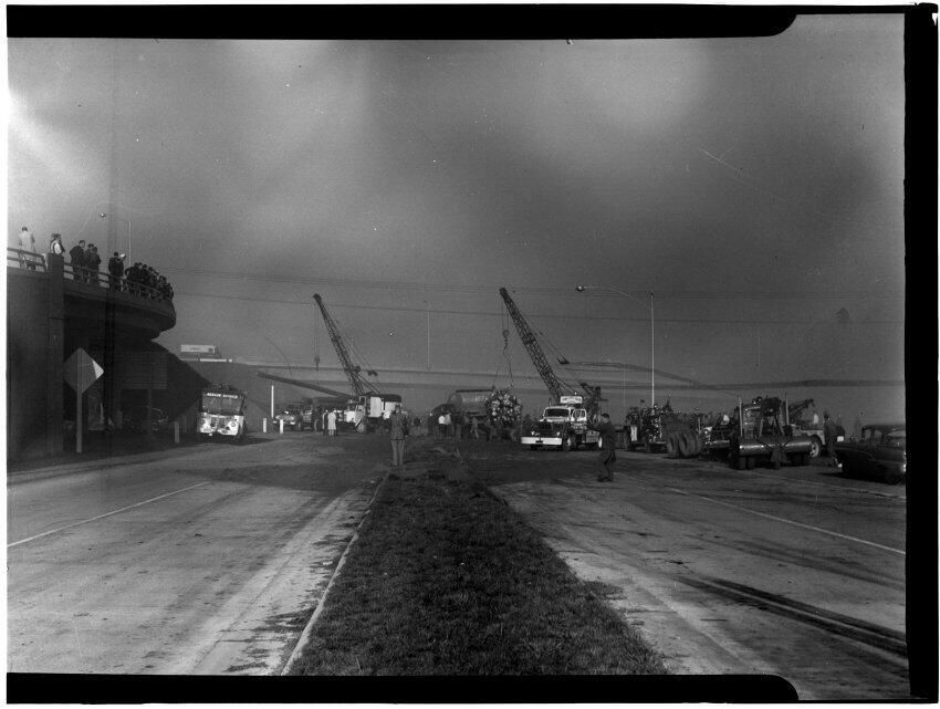Negative, sheet film. 2 x 3 b&w. Wreck on Interstate 5 just west of Olympia brewery. Driver of logging truck was killed.
