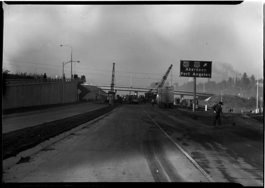 Negative, sheet film. 2 x 3 b&w. Wreck on Interstate 5 just west of Olympia brewery. Driver of logging truck was killed.