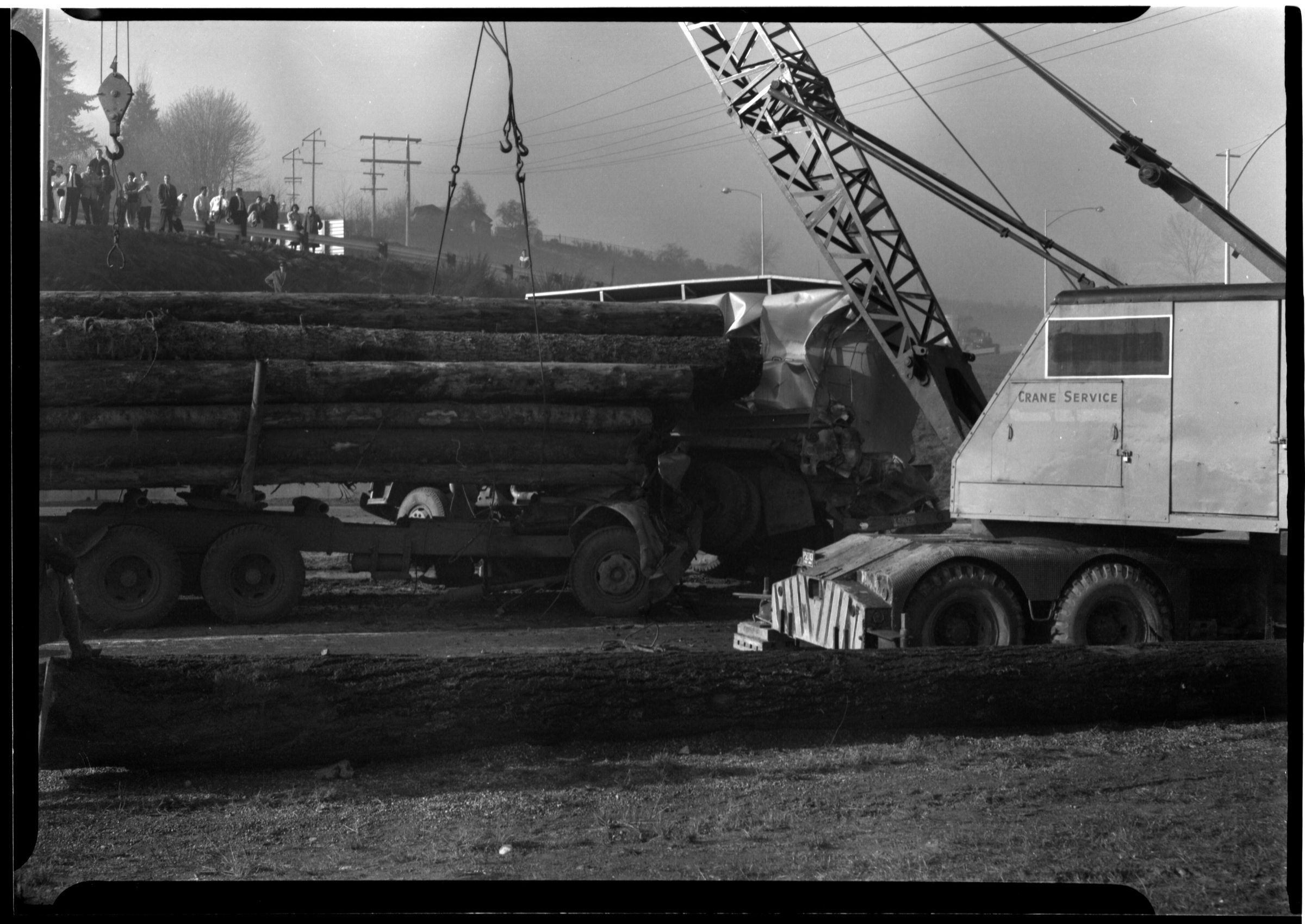 Negative, sheet film. 2 x 3 b&w. Wreck on Interstate 5 just west of Olympia brewery. Driver of logging truck was killed.