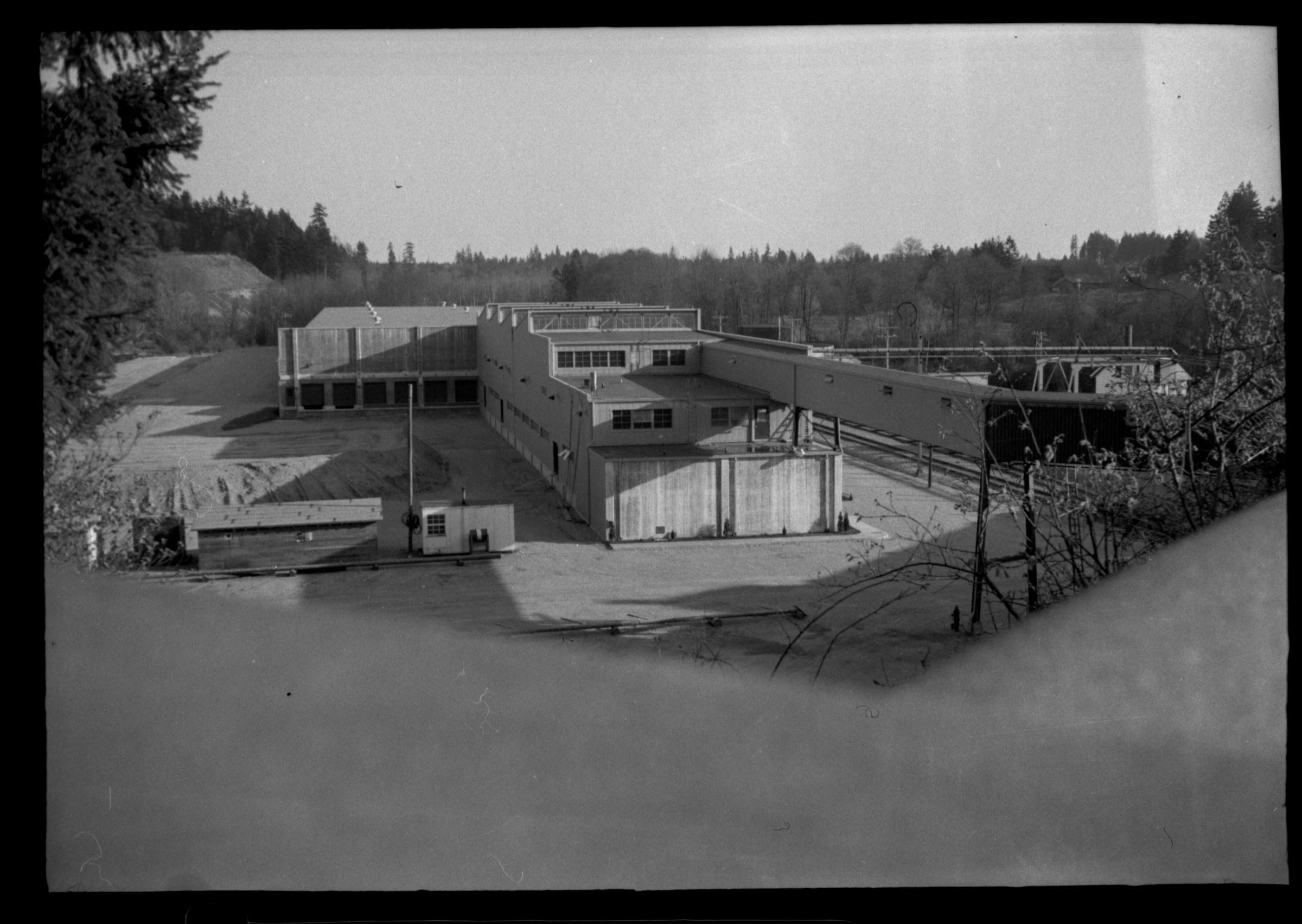 Negative, sheet film. 1 x 1.5 b&w. B bottleshop and warehouse area, railroad sidings, of Olympia brewery. Looking south. Tunnel coming in from right became the visitors' tunnel.