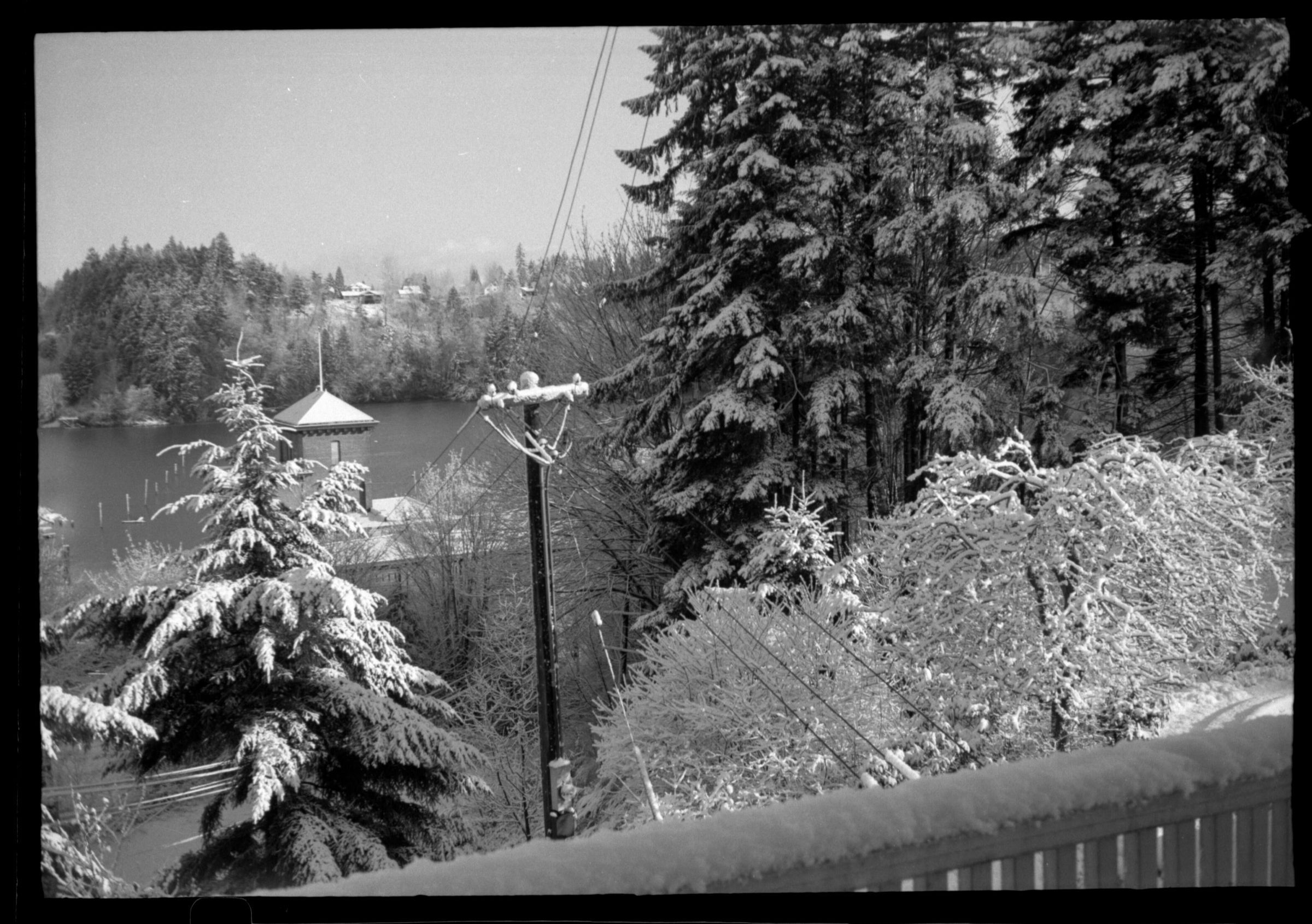 Negative, sheet film. 1 x 1.5 b&w. View of old Olympia brewery from Schmidt House. Olympia residential district in the distance. Looking north-northeast. Snow.