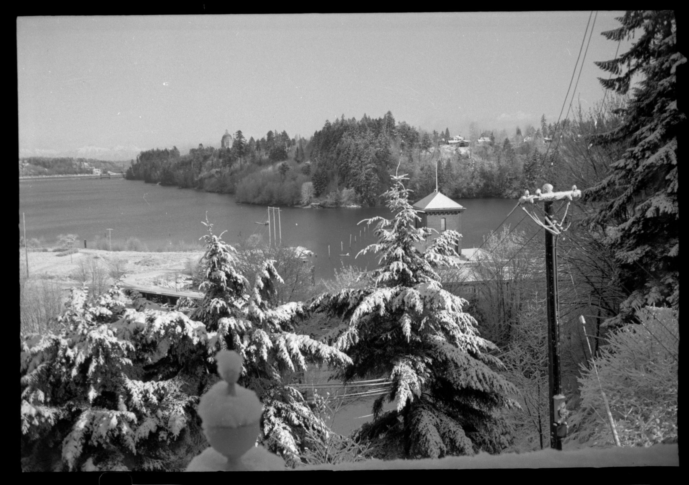Negative, sheet film. 1 x 1.5 b&w. View of old Olympia brewery from Schmidt House. Olympia residential district in the distance. Looking north-northeast. Snow.