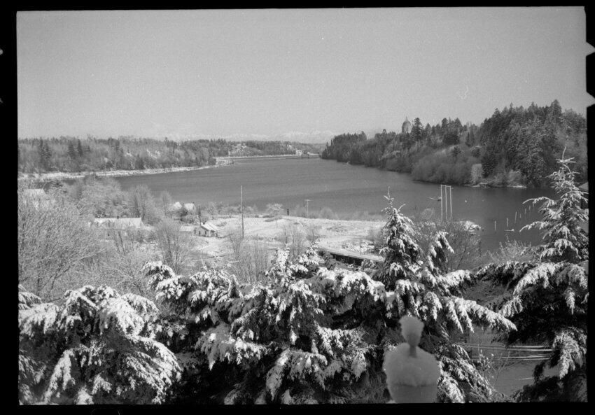 Negative, sheet film. 1 x 1.5 b&w. From Schmidt House. Looking north across Capitol Lake. Snow.