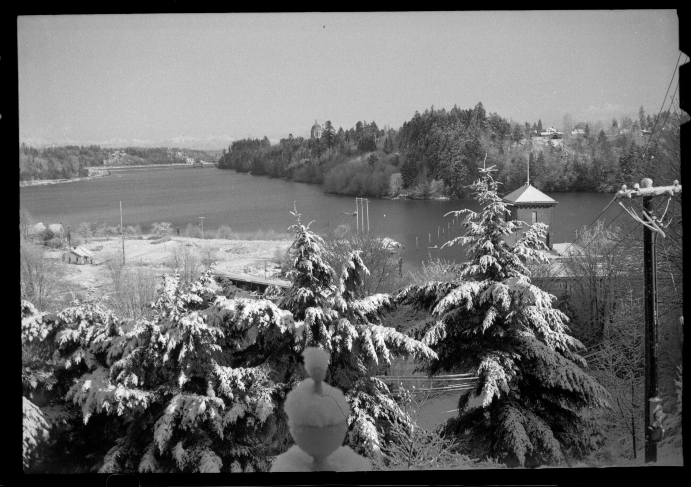 Negative, sheet film. 1 x 1.5 b&w. View of old Olympia brewery from Schmidt House. Olympia residential district in the distance. Looking north-northeast. Snow.