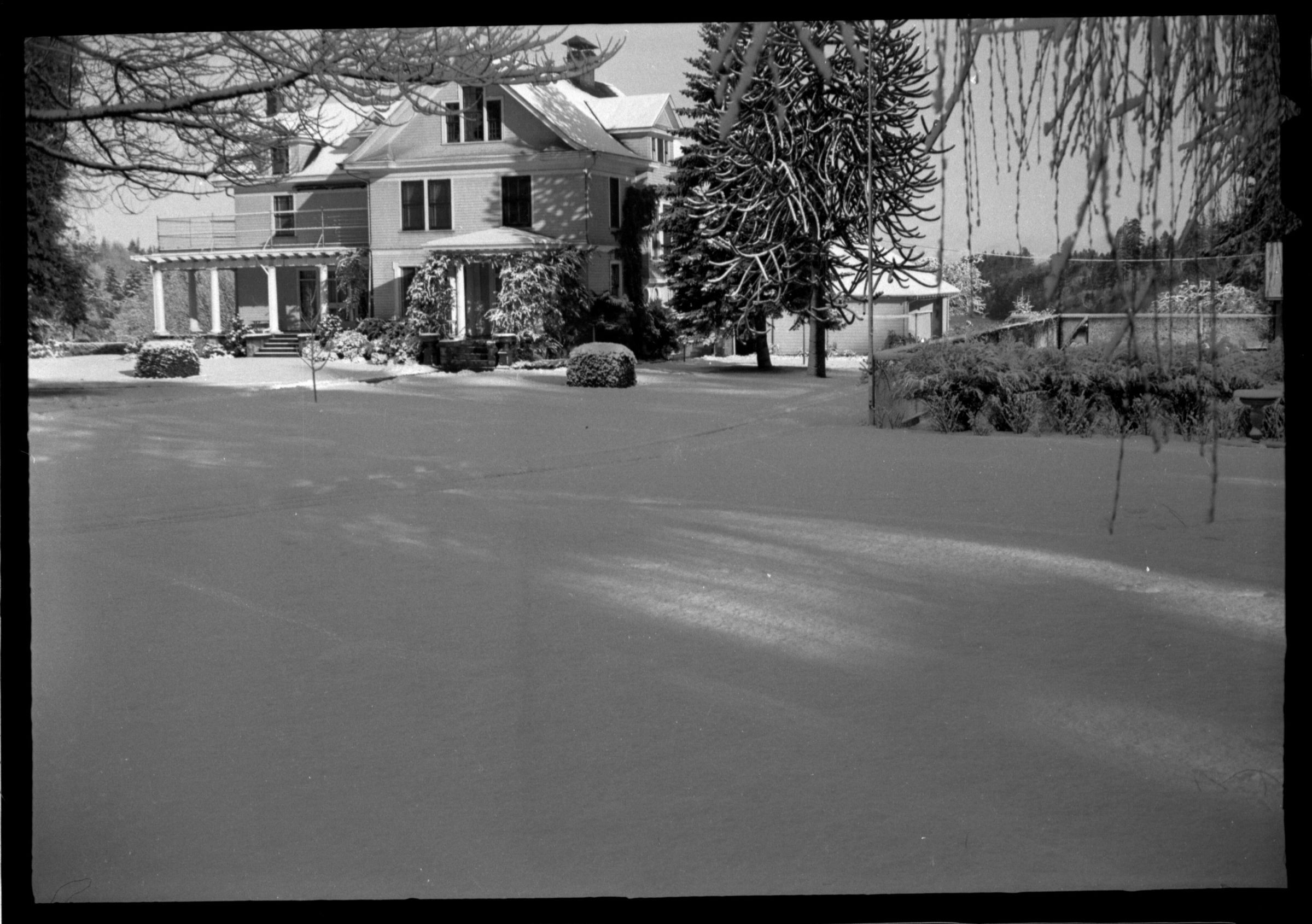 Negative, sheet film. 1 x 1.5 b&w. Schmidt House, looking north-northwest. Snow. Statues are missing from front yard; they used to be taken down in autumn and replaced in spring. Monkey puzzle tree in side yard.Name/Title
