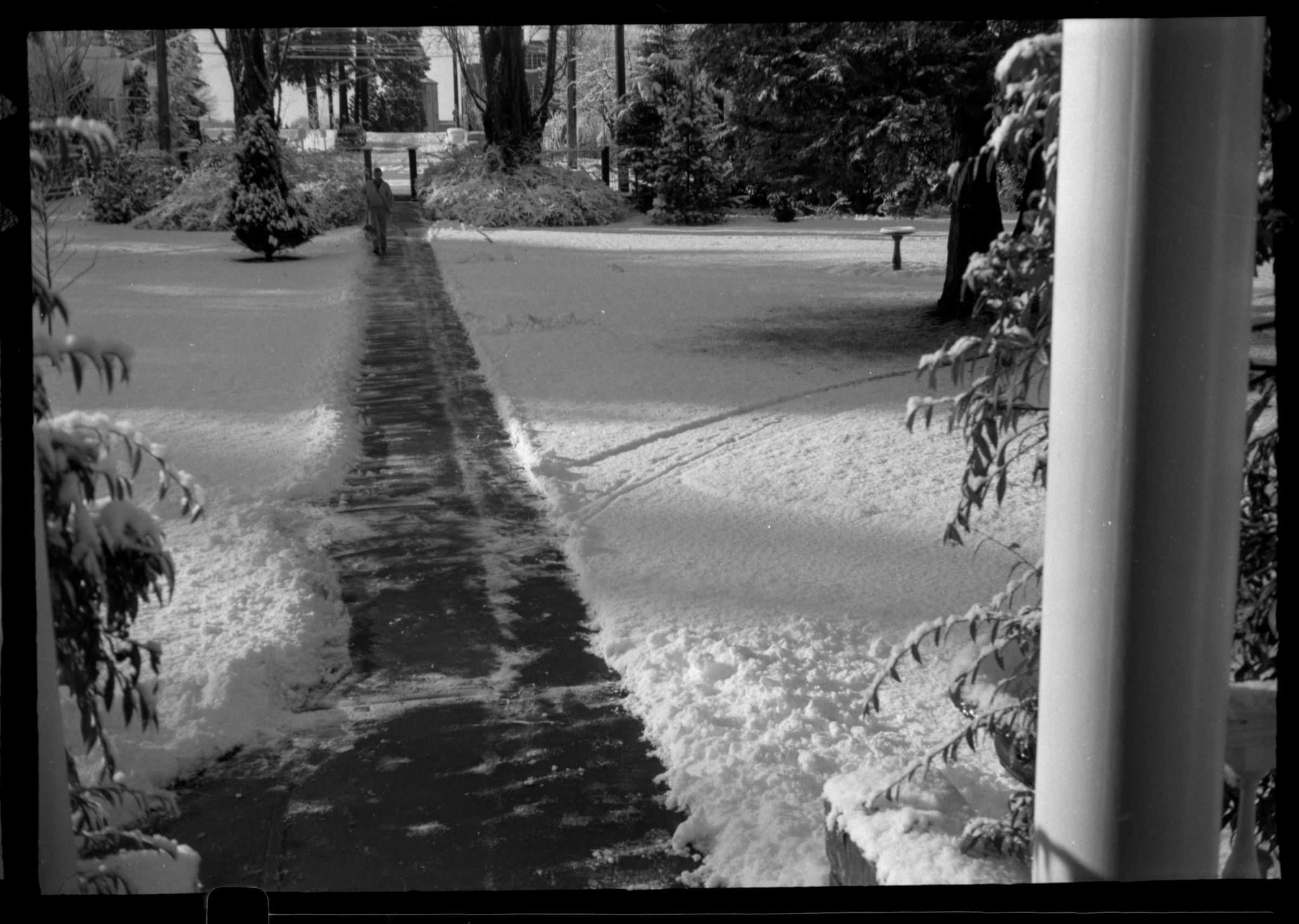 Negative, sheet film. 1 x 1.5 b&w. Looking south down front walk of Schmidt House, from front porch. Snow. No ID on person.