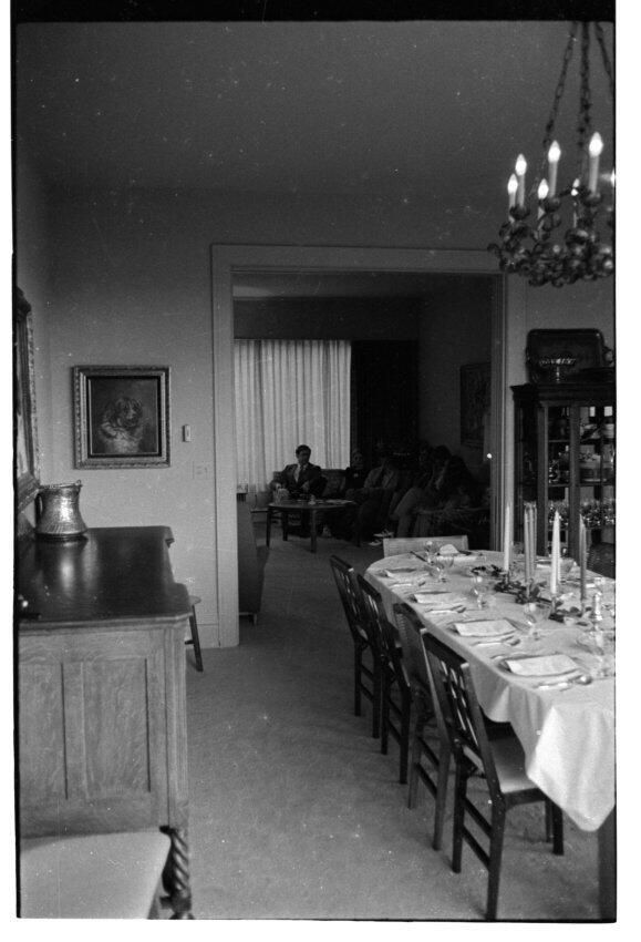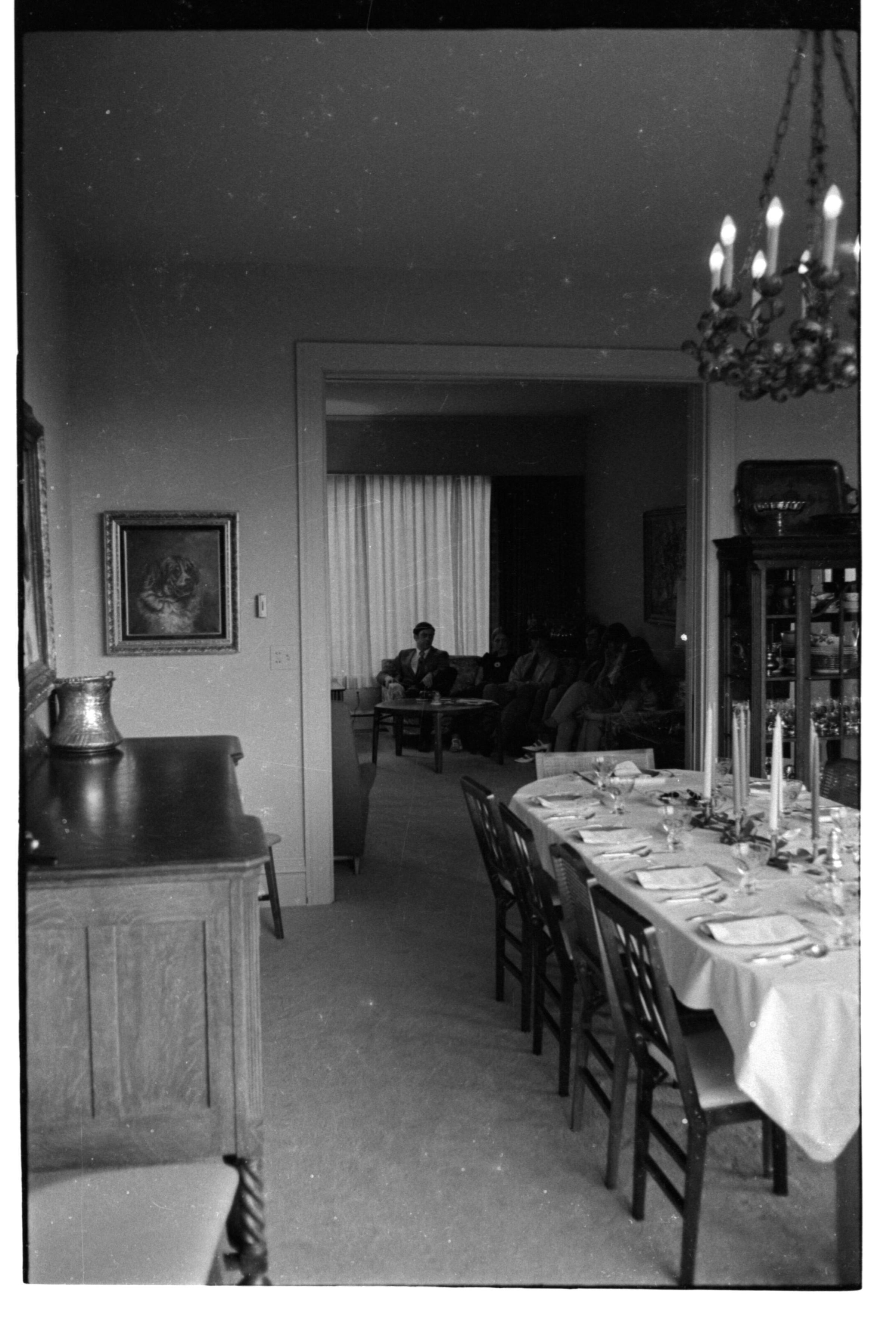 Negative, sheet film. 1.5 x 1 b&w. Schmidt House dining room, looking through to parlor. No ID on person