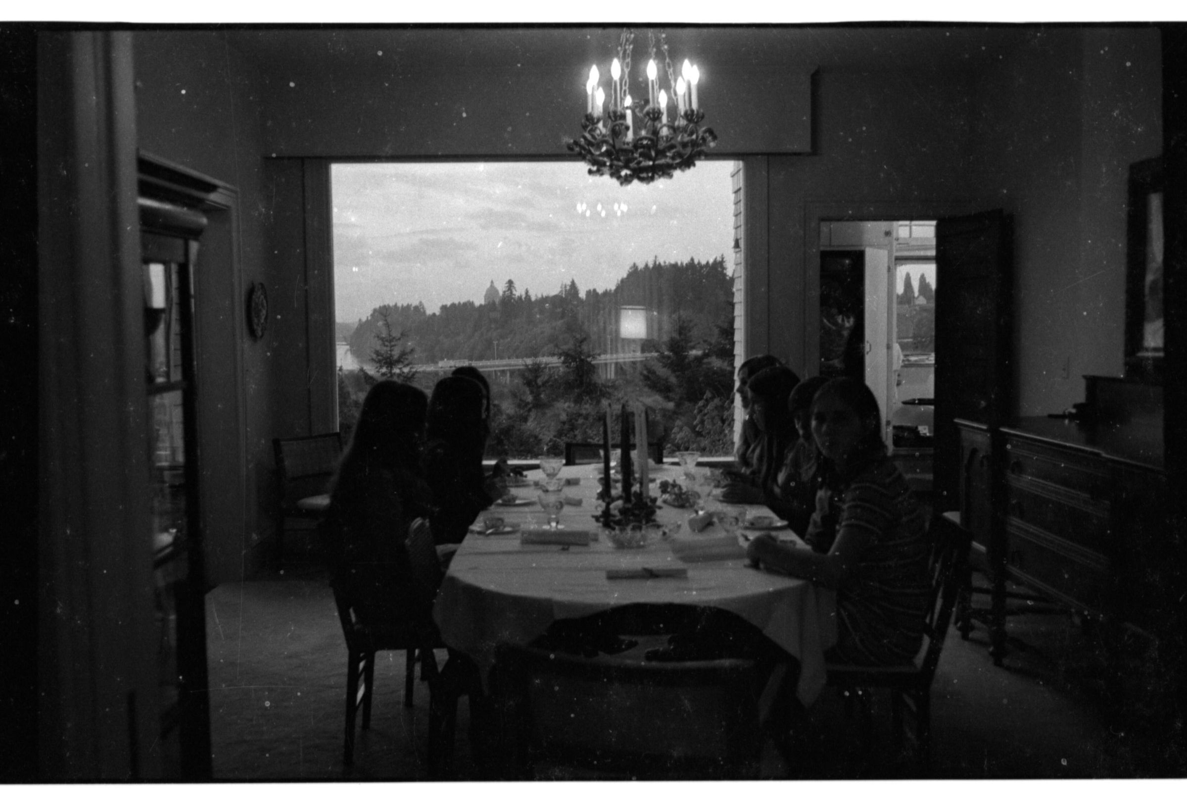 Negative, sheet film. 1 x 1.5 b&w. Dining room of Schmidt House. No ID on people.