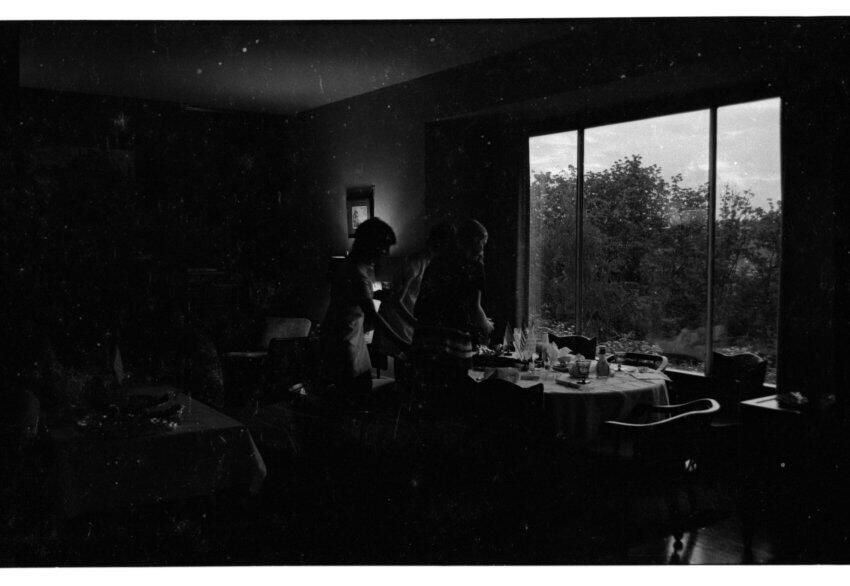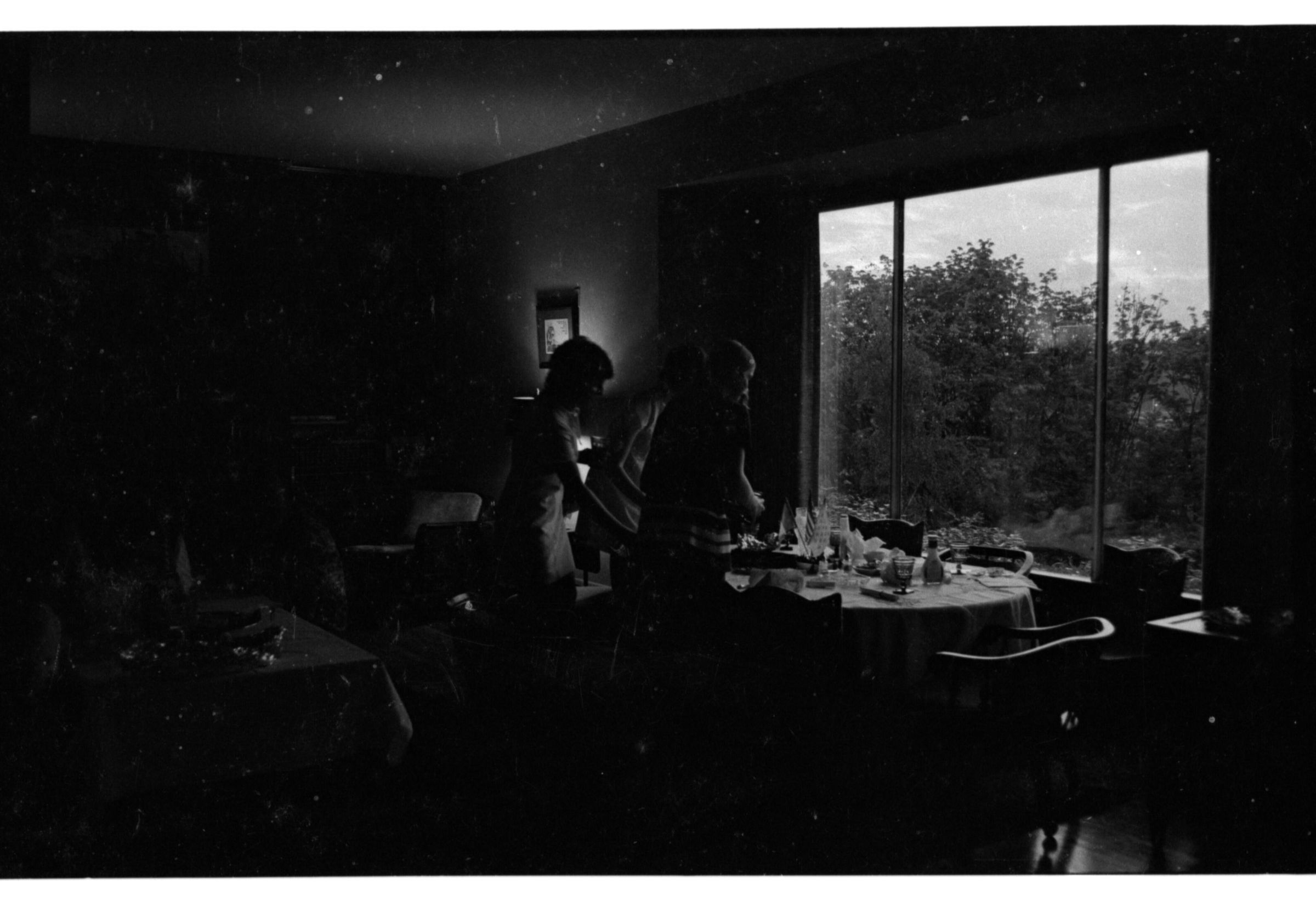 Negative, sheet film. 1 x 1.5 b&w. Front room of Schmidt House. No ID on people.