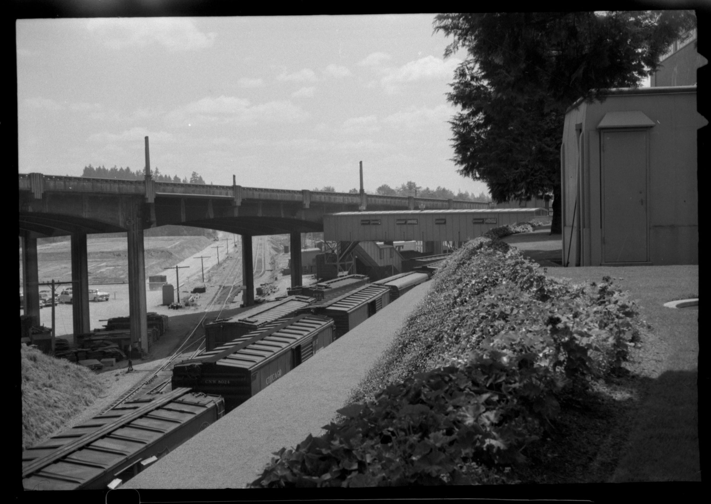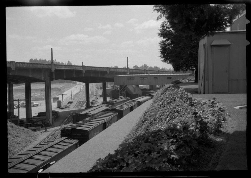 Negative, sheet film. 1 x 1.5 b&w. Railcars at east side of Oly brewery.