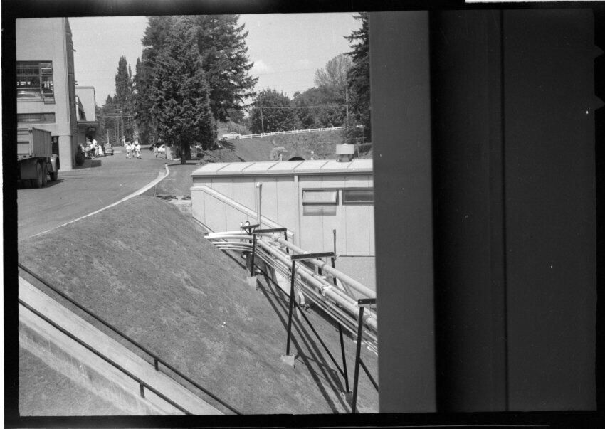 Negative, sheet film. 1 x 1.5 b&w. Steep slope on east side of brewery complex. Building on right is utility tunnel for keg conveyor, pipes, etc.