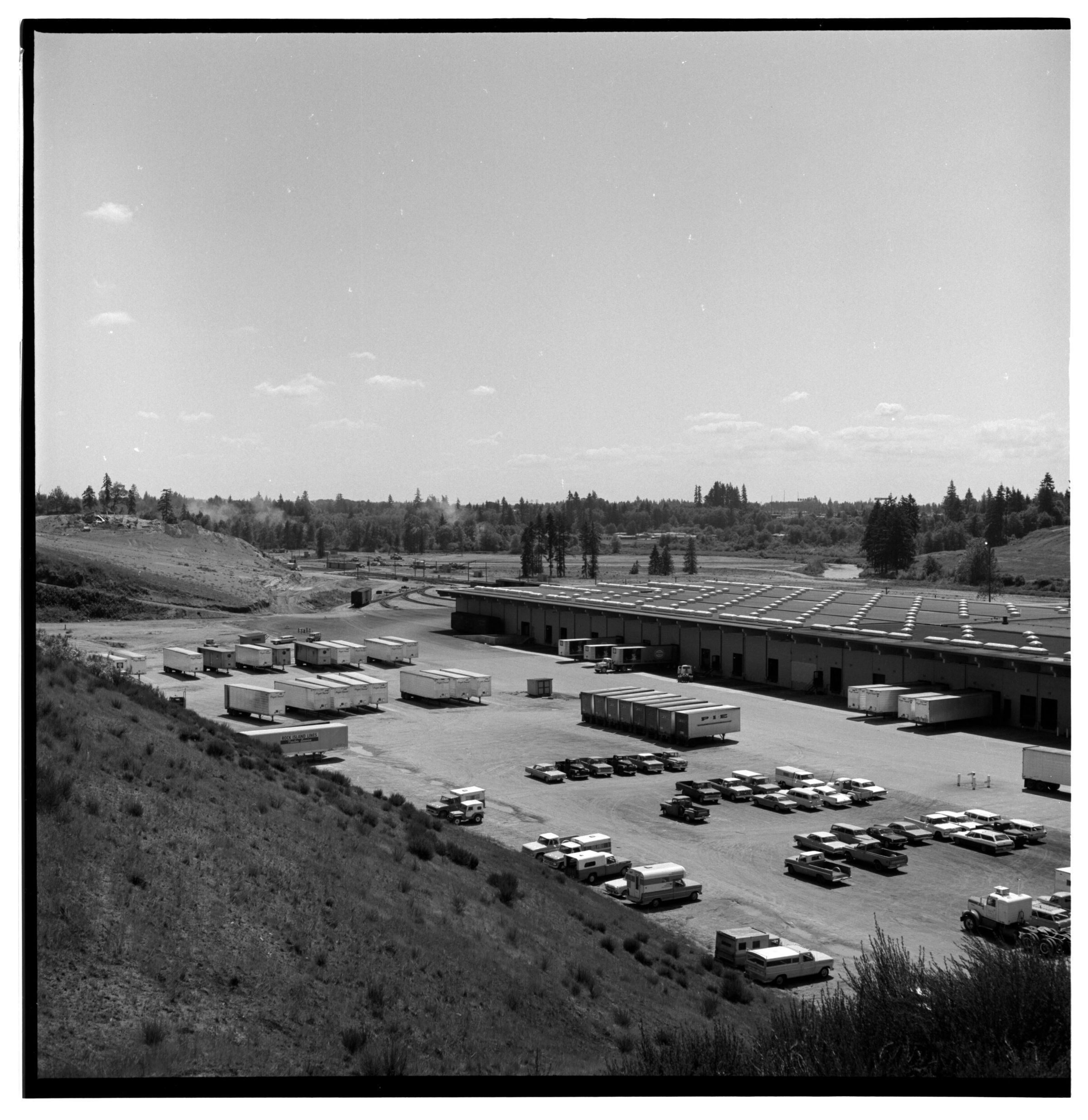 Negative, sheet film. 2 x 2 b&w. Looking southwest over warehouse/bottling buildings in valley.