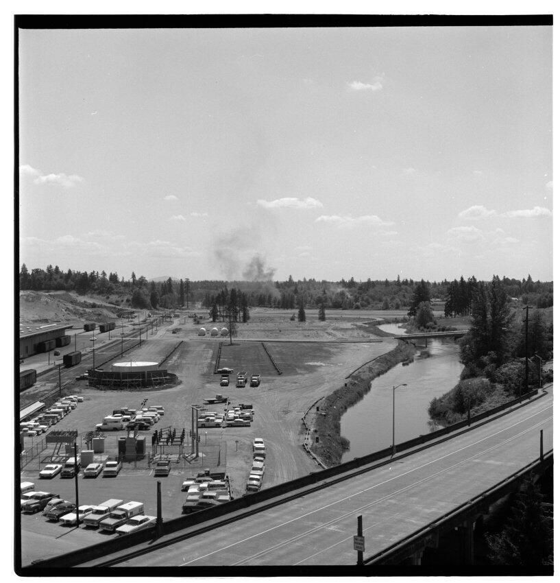 Negative, sheet film. 2 x 2 b&w. Looking southeast from Olympia brewery over Carlyon Bridge and warehouse/bottling buildings in valley.