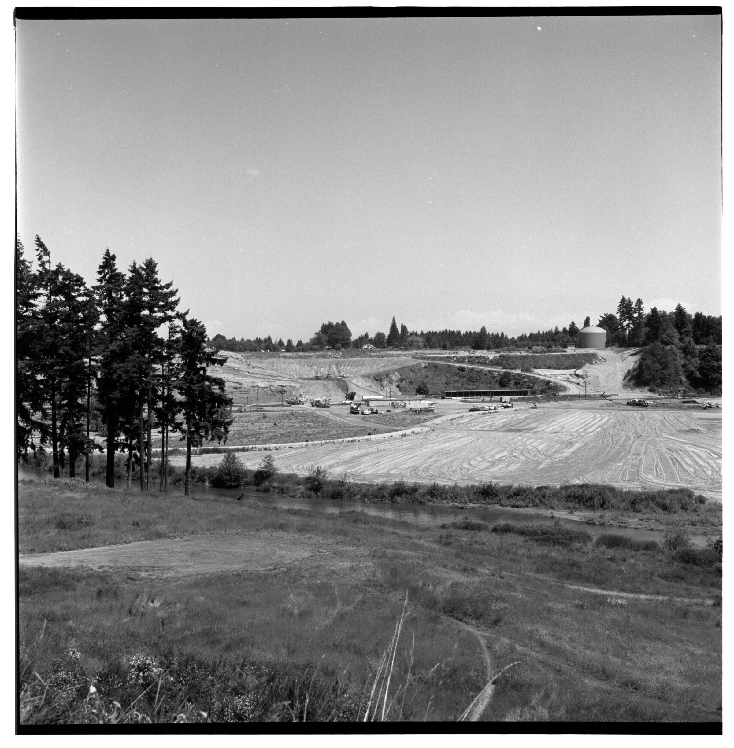 Negative, sheet film. 2 x 2 b&w. Looking east from Olympia brewery over Carlyon Bridge and warehouse/bottling buildings in valley. Probably during construction of golf course. Million gallon water tank in right background.Other Names and Numbers