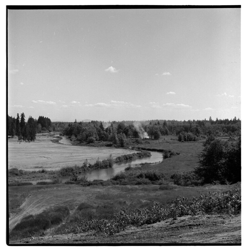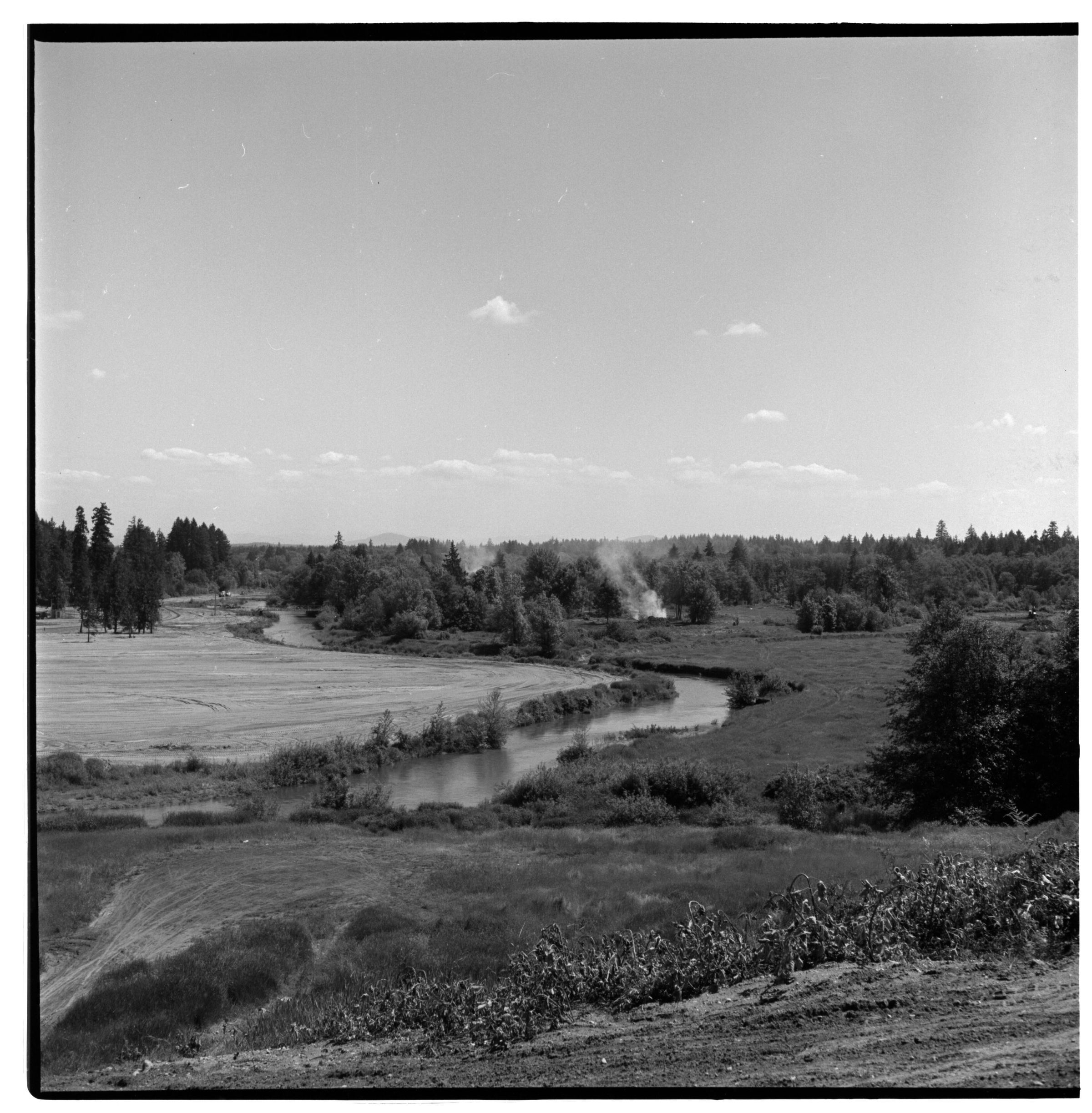 Negative, sheet film. 2 x 2 b&w. Probably Deschutes River winding through valley south of Olympia Brewery.