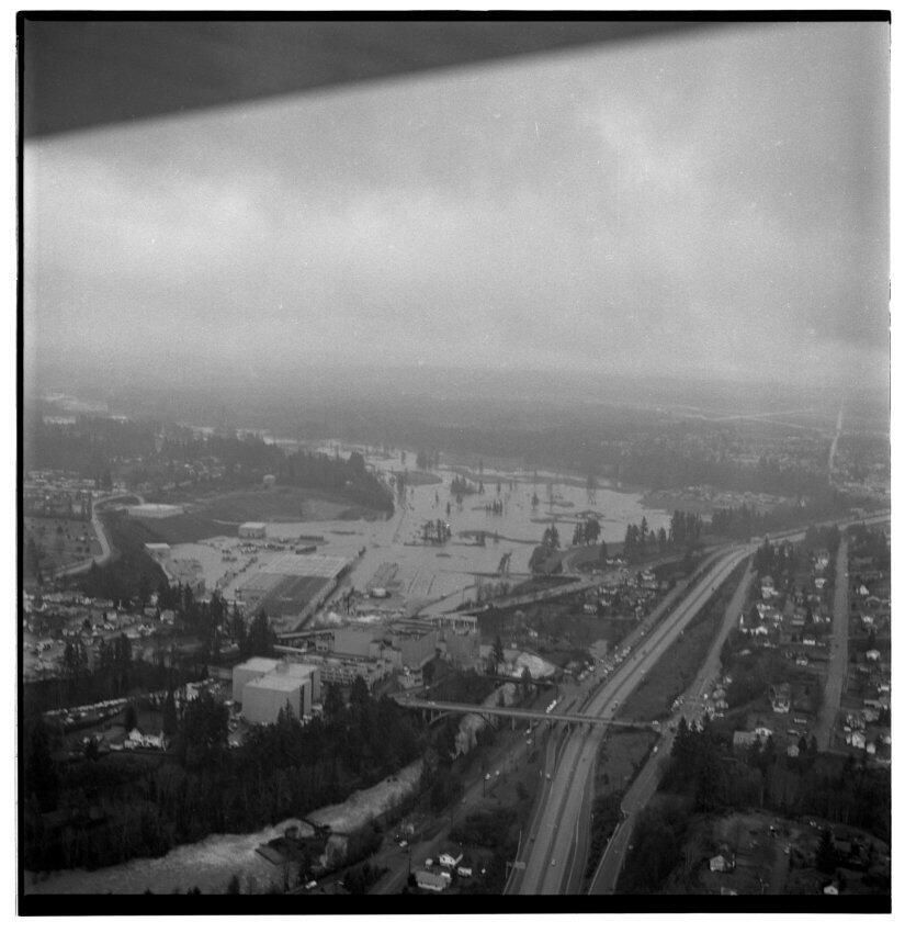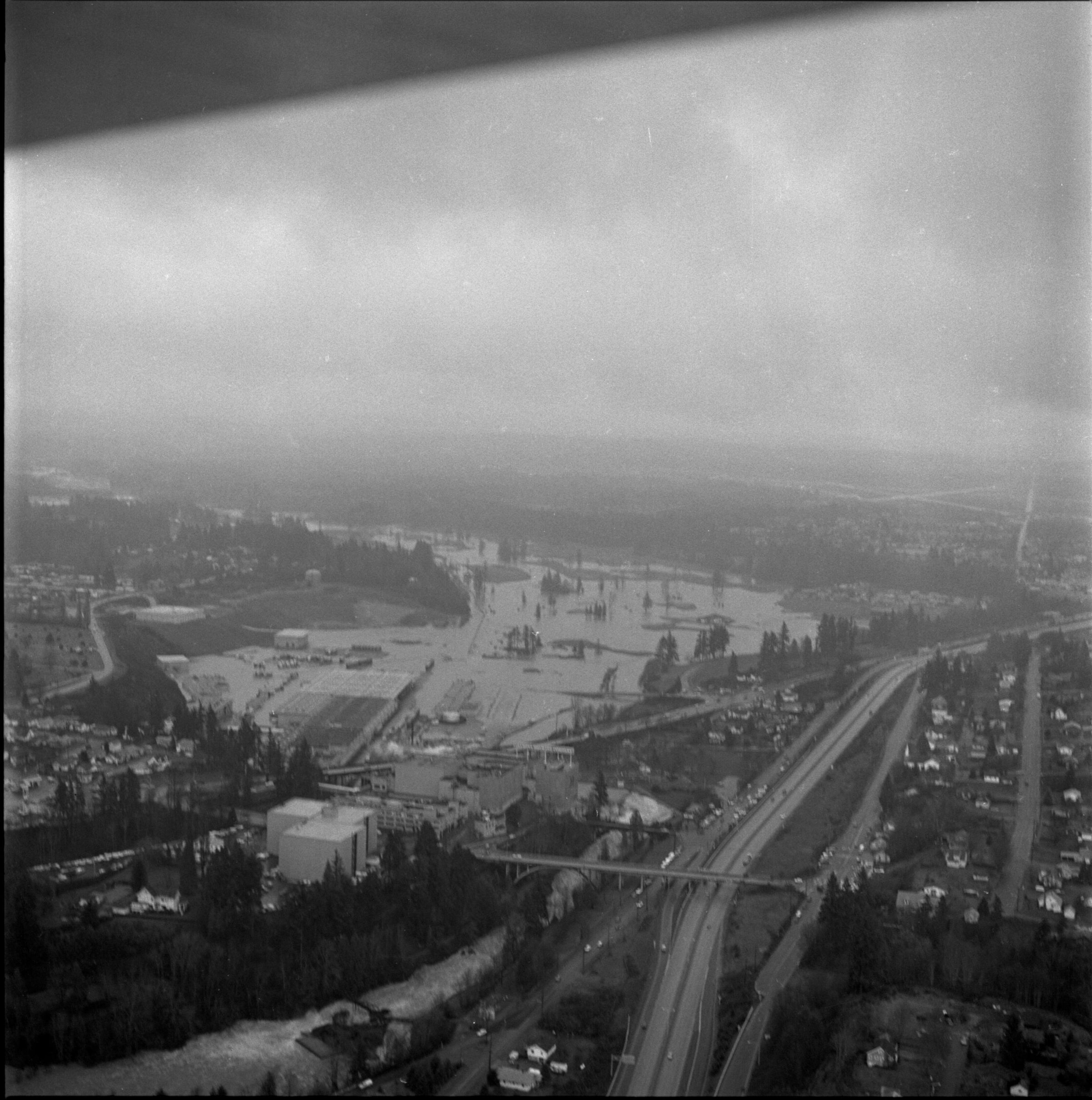 Negative, sheet film. 2 x 2 b&w. Aerial view of Tumwater, looking south. Olympia Brewery in left foreground, I-5 cutting through right side, major flooding of Deschutes River valley in middle.Other Names and Numbers