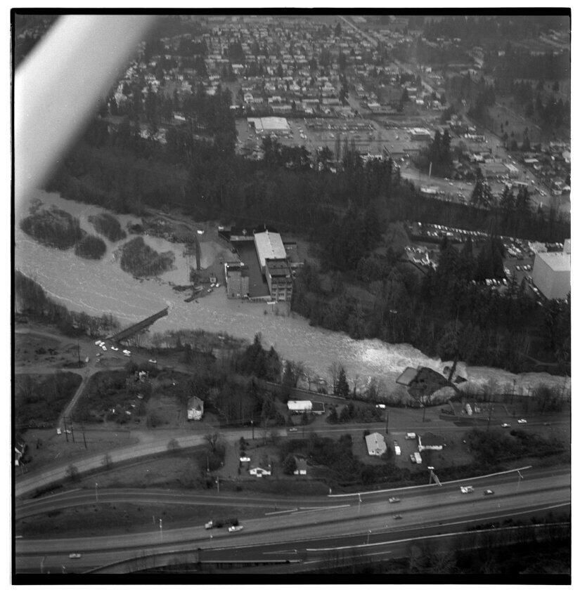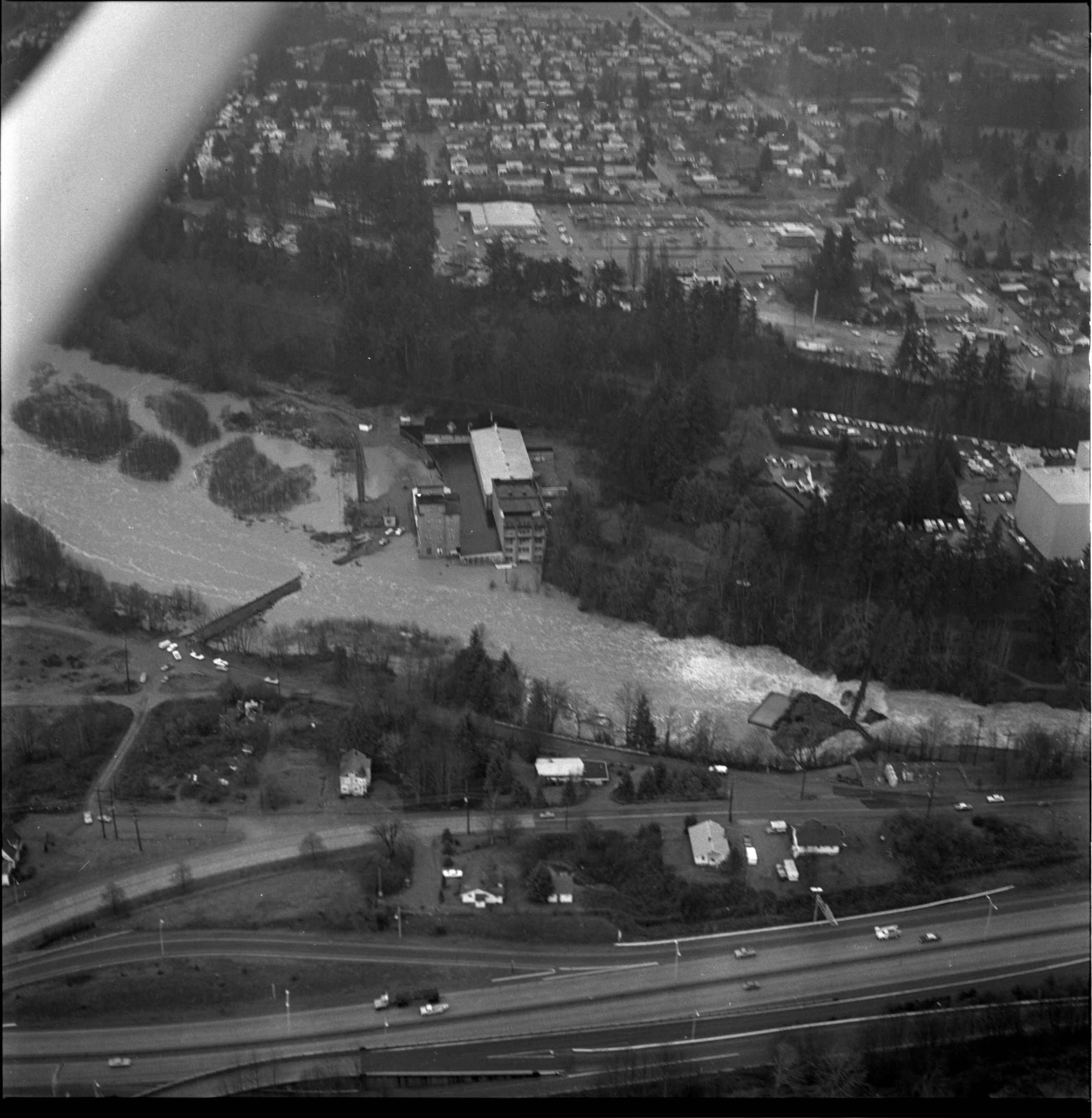 Negative, sheet film. 2 x 2 b&w. Aerial view of Tumwater, looking east. Old Olympia Brewery in center, I-5 cutting through bottom, major flooding of Deschutes River in middle.Other Names and Numbers
