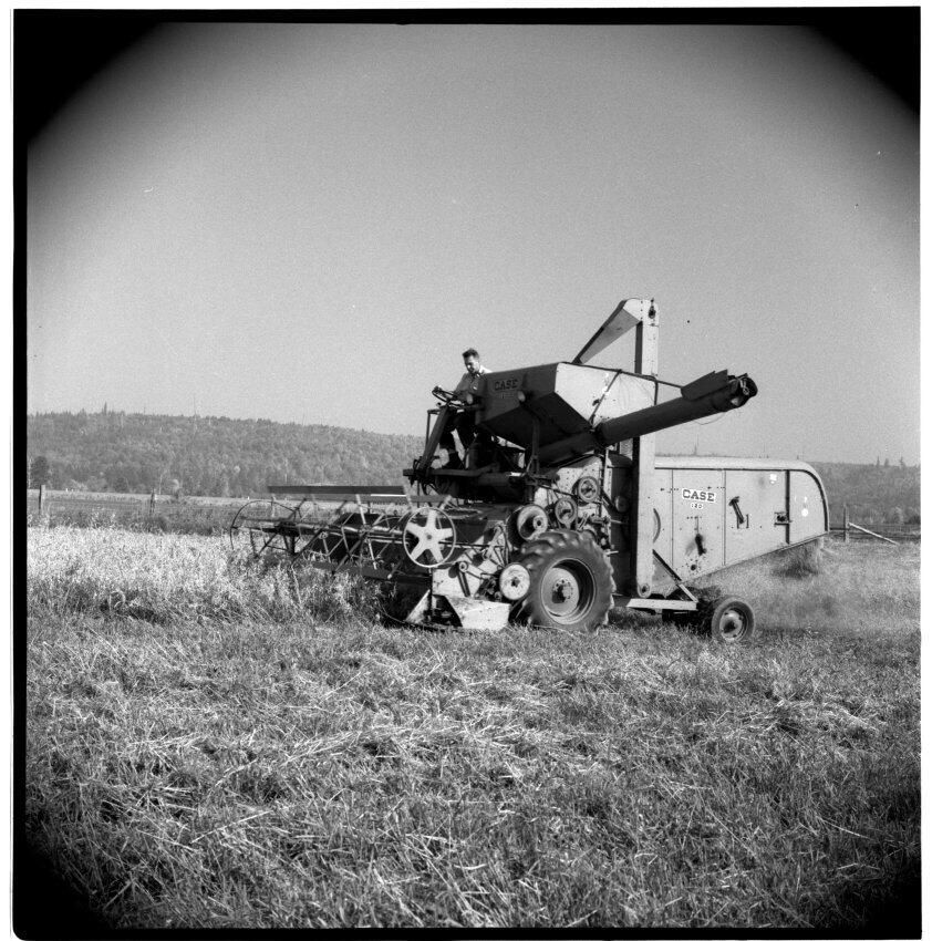 Negative, sheet film. 2 x 2 b&w. No. 775. Harvesting oats at Hamilton Farm, Chehalis, for use as turkey feed. See It's the Water News: Nov 1960.