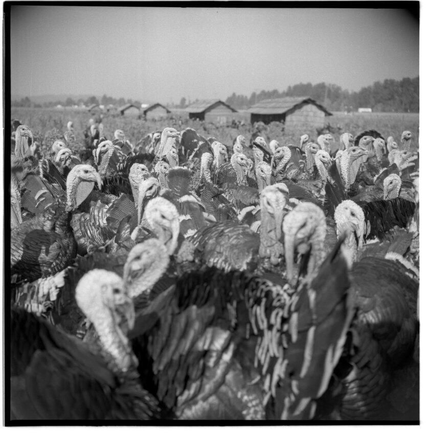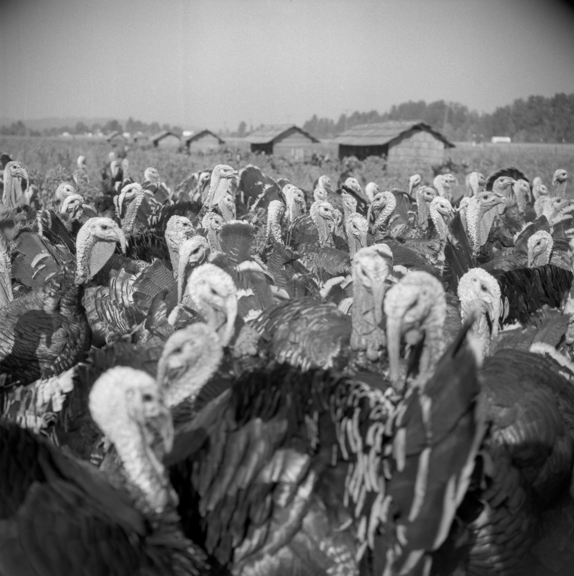 Negative, sheet film. 2 x 2 b&w. No. 775. Turkeys, Hamilton Farm, Chehalis; using brewers' yeast produced by Olympia Brewery as feed supplement. See It's the Water News: Nov 1960.