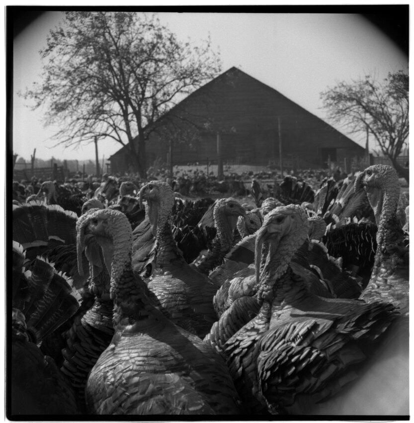 Negative, sheet film. 2 x 2 b&w. No. 775. Turkeys, Hamilton Farm, Chehalis; using brewers' yeast produced by Olympia Brewery as feed supplement. See It's the Water News: Nov 1960.