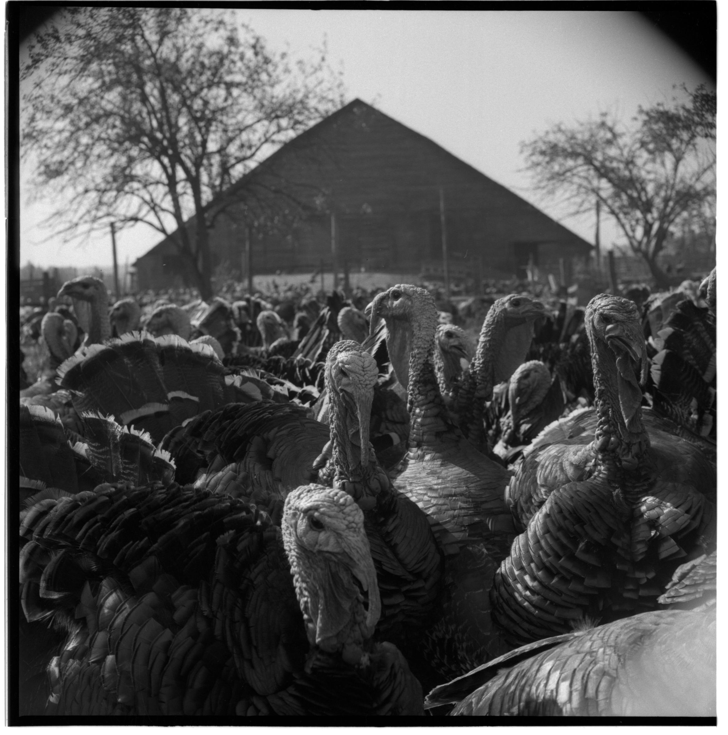Negative, sheet film. 2 x 2 b&w. No. 775. Turkeys, Hamilton Farm, Chehalis; using brewers' yeast produced by Olympia Brewery as feed supplement. See It's the Water News: Nov 1960.