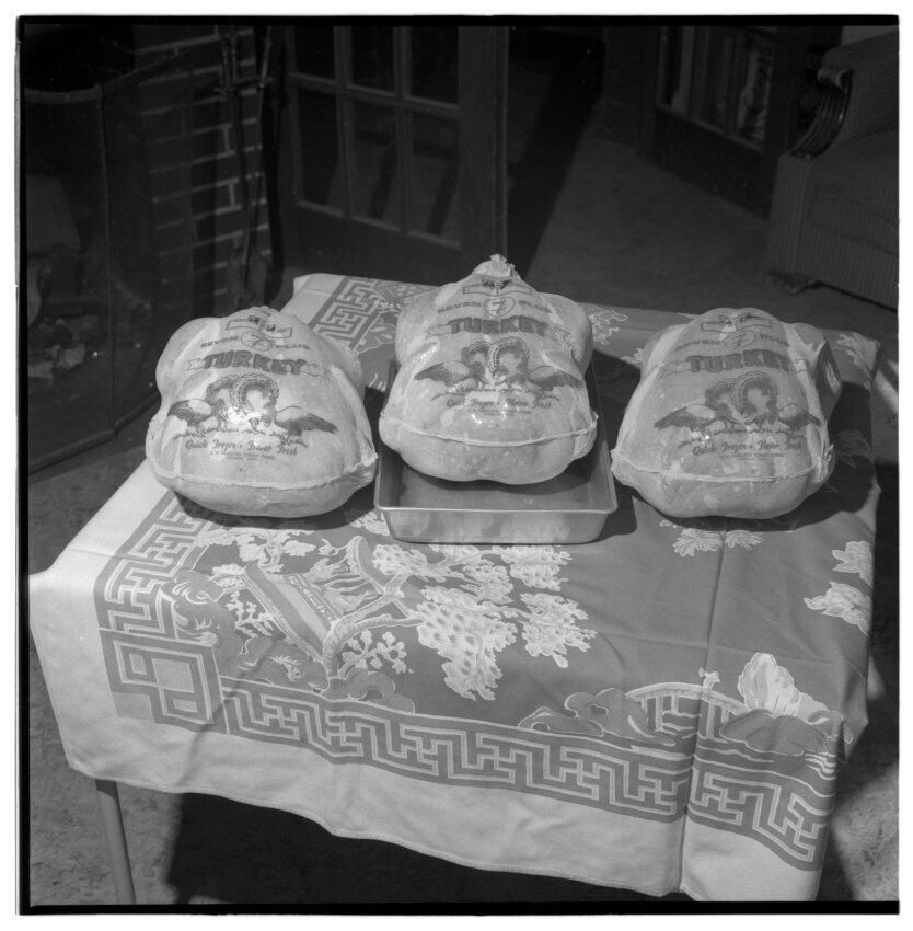 Negative, sheet film. 2 x 2 b&w. No. 775. Turkeys, Hamilton Farm, Chehalis; using brewers' yeast produced by Olympia Brewery as feed supplement. See It's the Water News: Nov 1960.