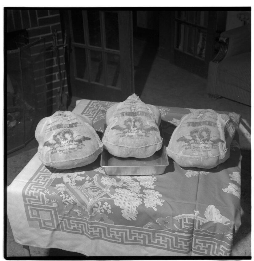 Negative, sheet film. 2 x 2 b&w. No. 775. Turkeys, Hamilton Farm, Chehalis; using brewers' yeast produced by Olympia Brewery as feed supplement. See It's the Water News: Nov 1960.