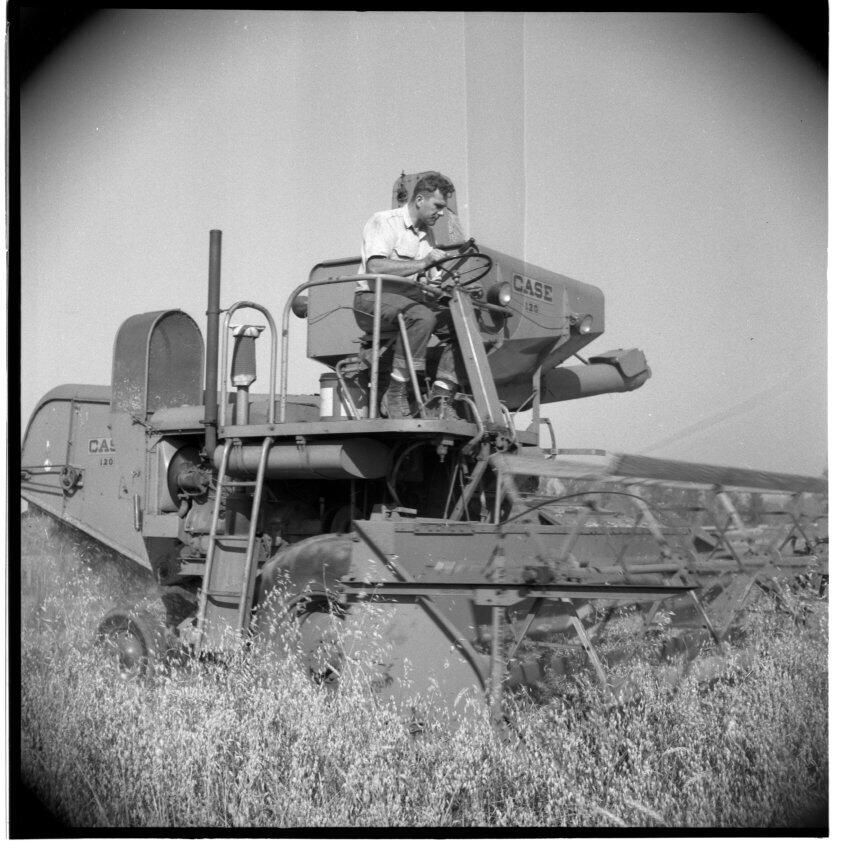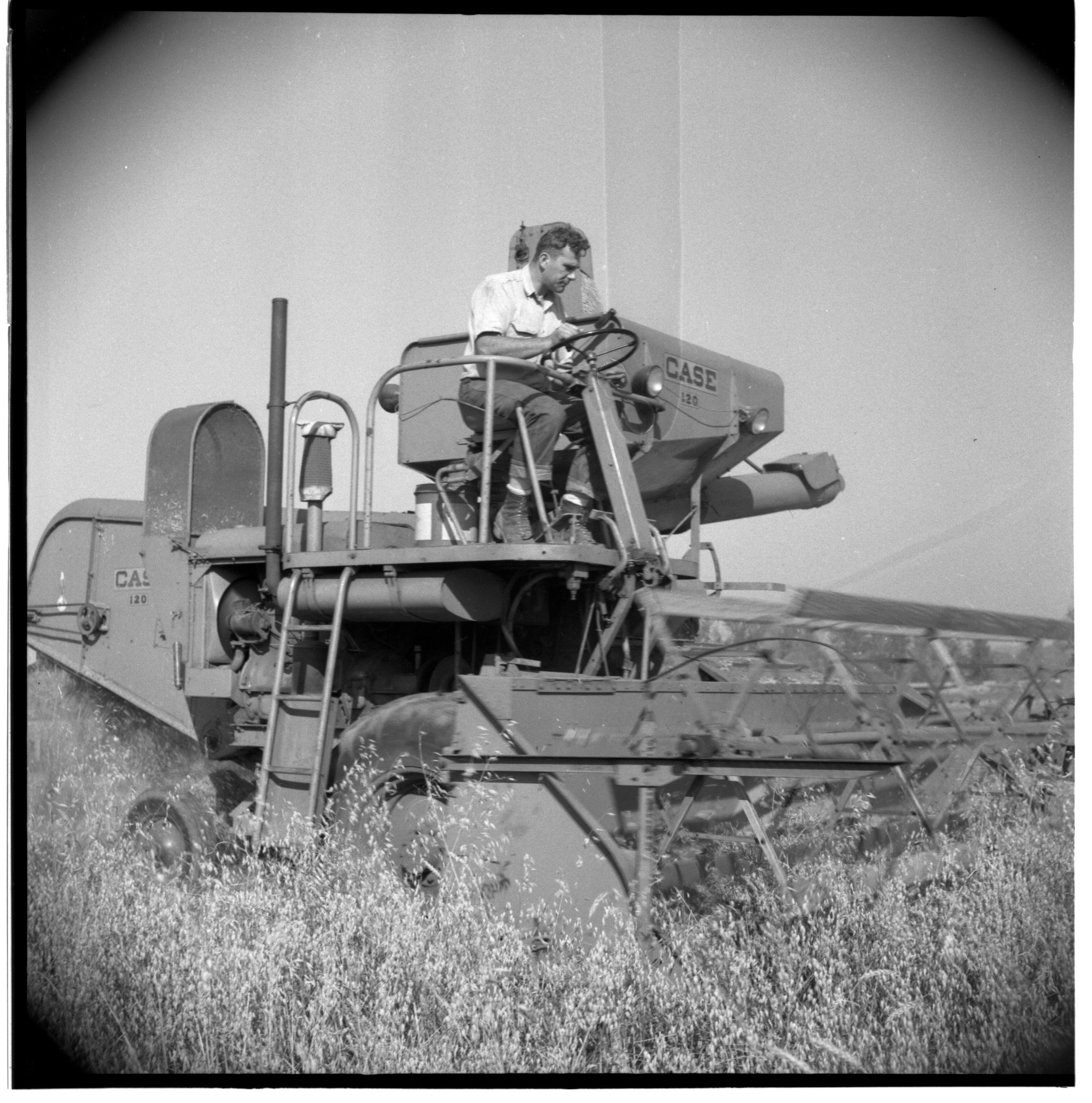 Negative, sheet film. 2 x 2 b&w. No. 775. Harvesting oats at Hamilton Farm, Chehalis, for use as turkey feed. See It's the Water News: Nov 1960.