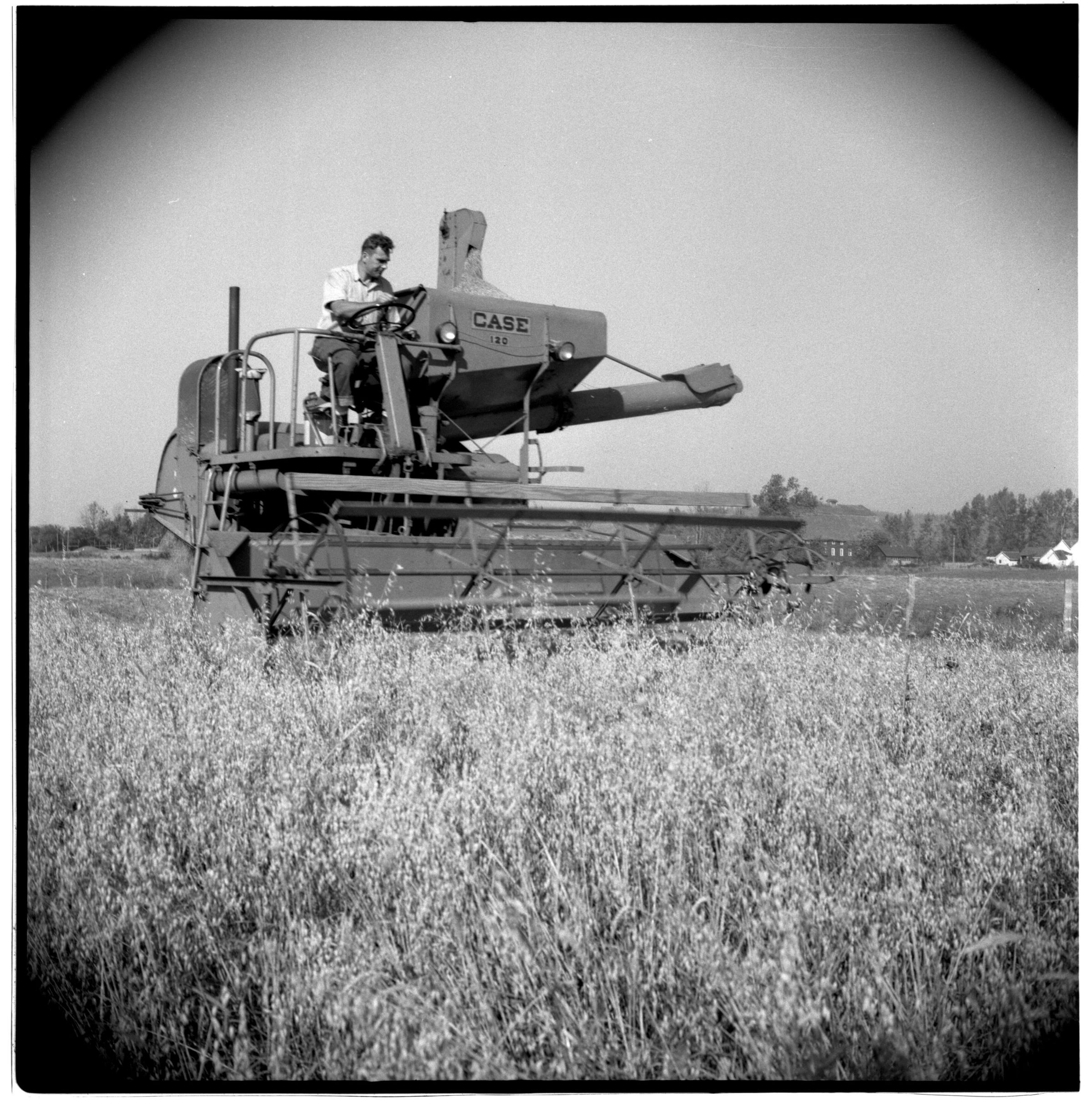 Negative, sheet film. 2 x 2 b&w. No. 775. Harvesting oats at Hamilton Farm, Chehalis, for use as turkey feed. See It's the Water News: Nov 1960.