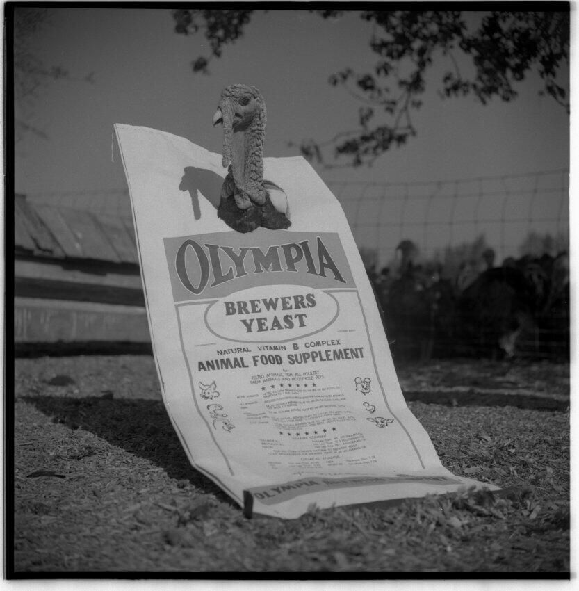 Negative, sheet film. 2 x 2 b&w. No. 775. Turkeys, Hamilton Farm, Chehalis; using brewers' yeast produced by Olympia Brewery as feed supplement. See It's the Water News: Nov 1960.