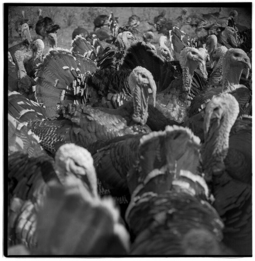 Negative, sheet film. 2 x 2 b&w. No. 775. Turkeys, Hamilton Farm, Chehalis; using brewers' yeast produced by Olympia Brewery as feed supplement. See It's the Water News: Nov 1960.