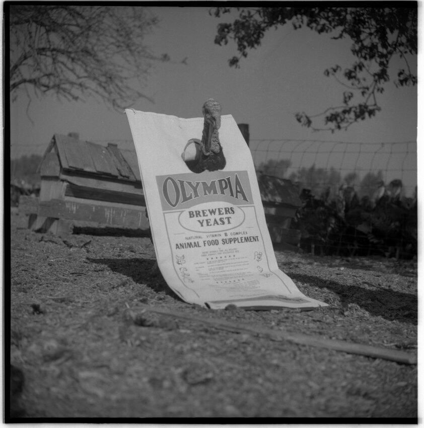 Negative, sheet film. 2 x 2 b&w. No. 775. Turkeys, Hamilton Farm, Chehalis; using brewers' yeast produced by Olympia Brewery as feed supplement. See It's the Water News: Nov 1960.