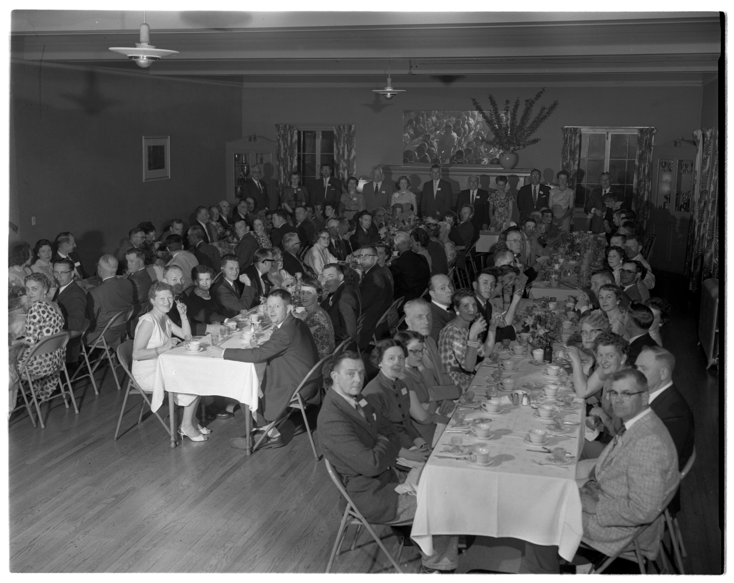 Negative, sheet film. 4 x 5 b&w. Professional associations. Group of unidentified people seated for dinner at unknown location, probably in Olympia.