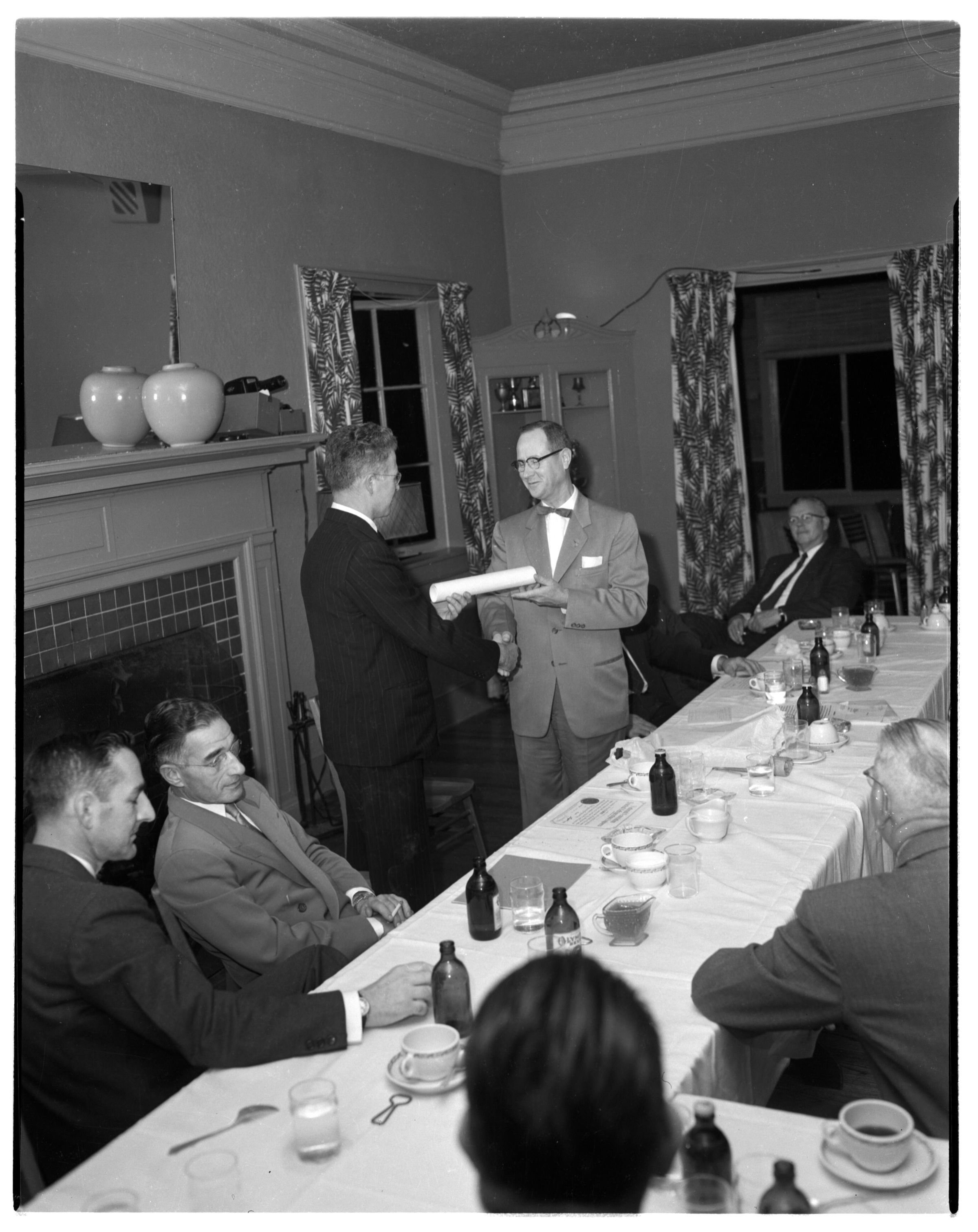Negative, sheet film. 5 x 4 b&w. Professional associations. No. 253. National Association of Practical Refrigerating Engineers. Receipt of charter. Bink Schmidt seated at far left. No ID on other men.Name/Title