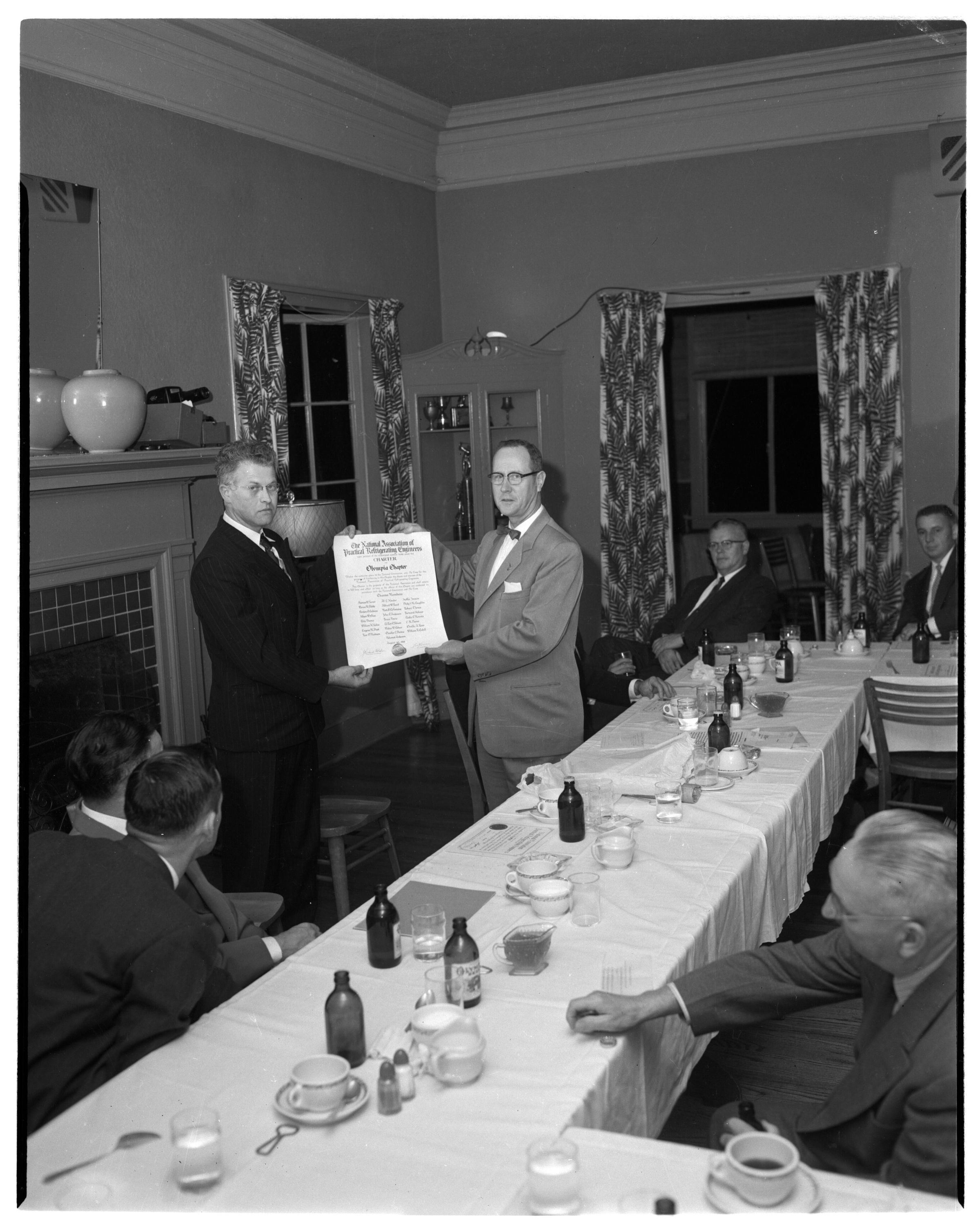 Negative, sheet film. 5 x 4 b&w. Professional associations. No. 253. National Association of Practical Refrigerating Engineers. Receipt of charter. No ID on men.