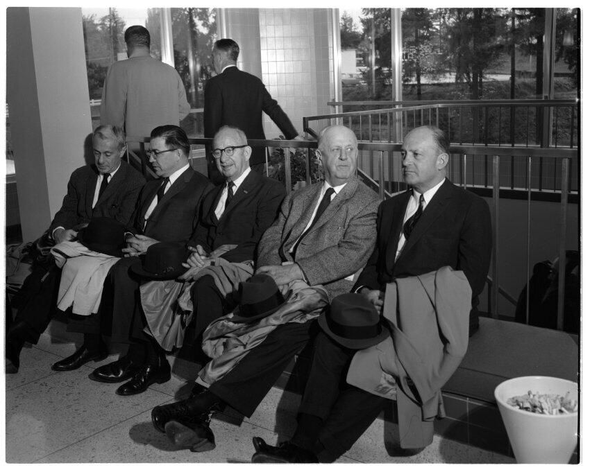 Negative, sheet film. 4 x 5 b&w. Professional associations. No. 885. United States Brewers Association visits Olympia brewery. No ID on men.