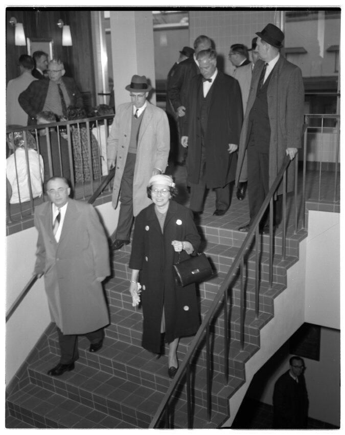 Negative, sheet film. 5 x 4 b&w. Professional associations. No. 885. United States Brewers Association visits Olympia brewery. No ID.
