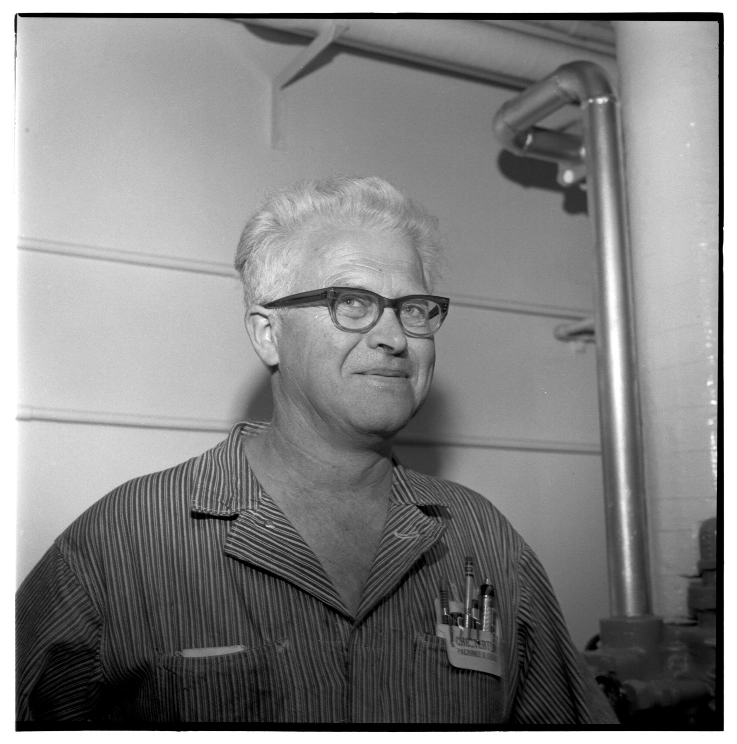 Negative, sheet film. 2 x 2 b&w. No. 253. Albert W. Giles, Olympia brewery machinist, took care of CO2 compressing machinery. Off duty, had a steam-powered boat for recreation.