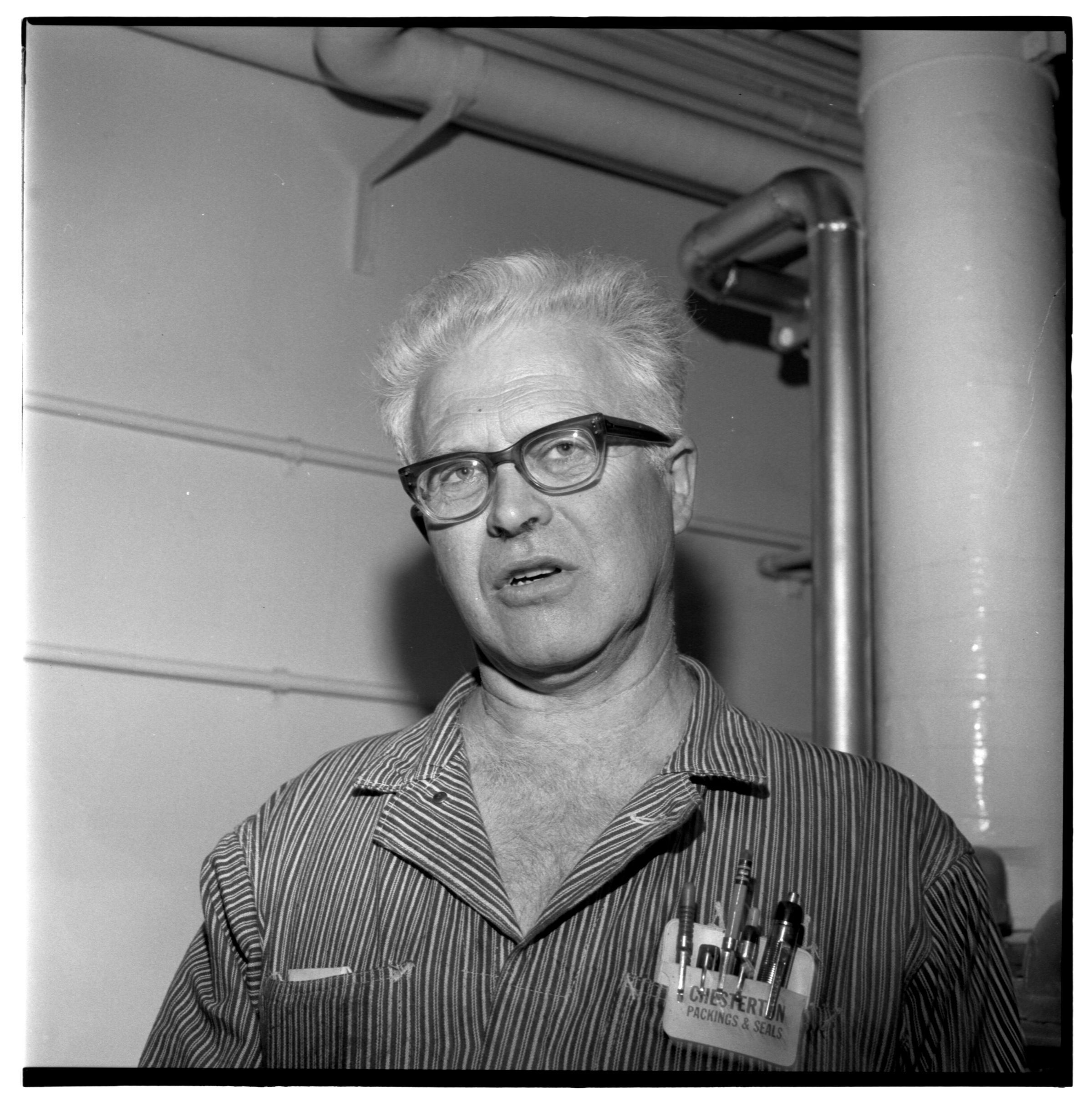 Negative, sheet film. 2 x 2 b&w. No. 253. Albert W. Giles, Olympia brewery machinist, took care of CO2 compressing machinery.