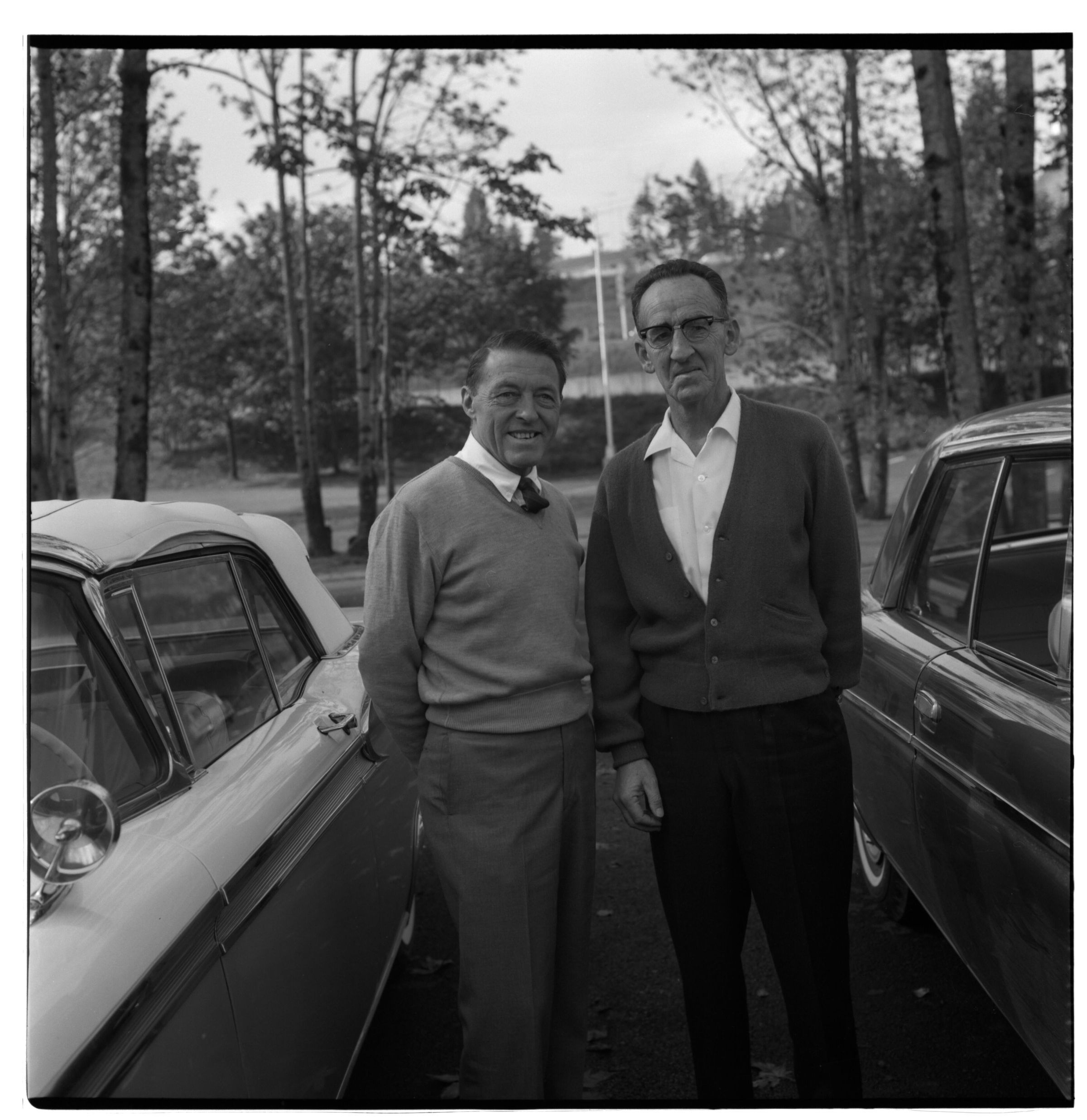 Negative, sheet film. 2 x 2 b&w. Unidentified man and Adolph "Bump" Schmidt standing between two parked cars.