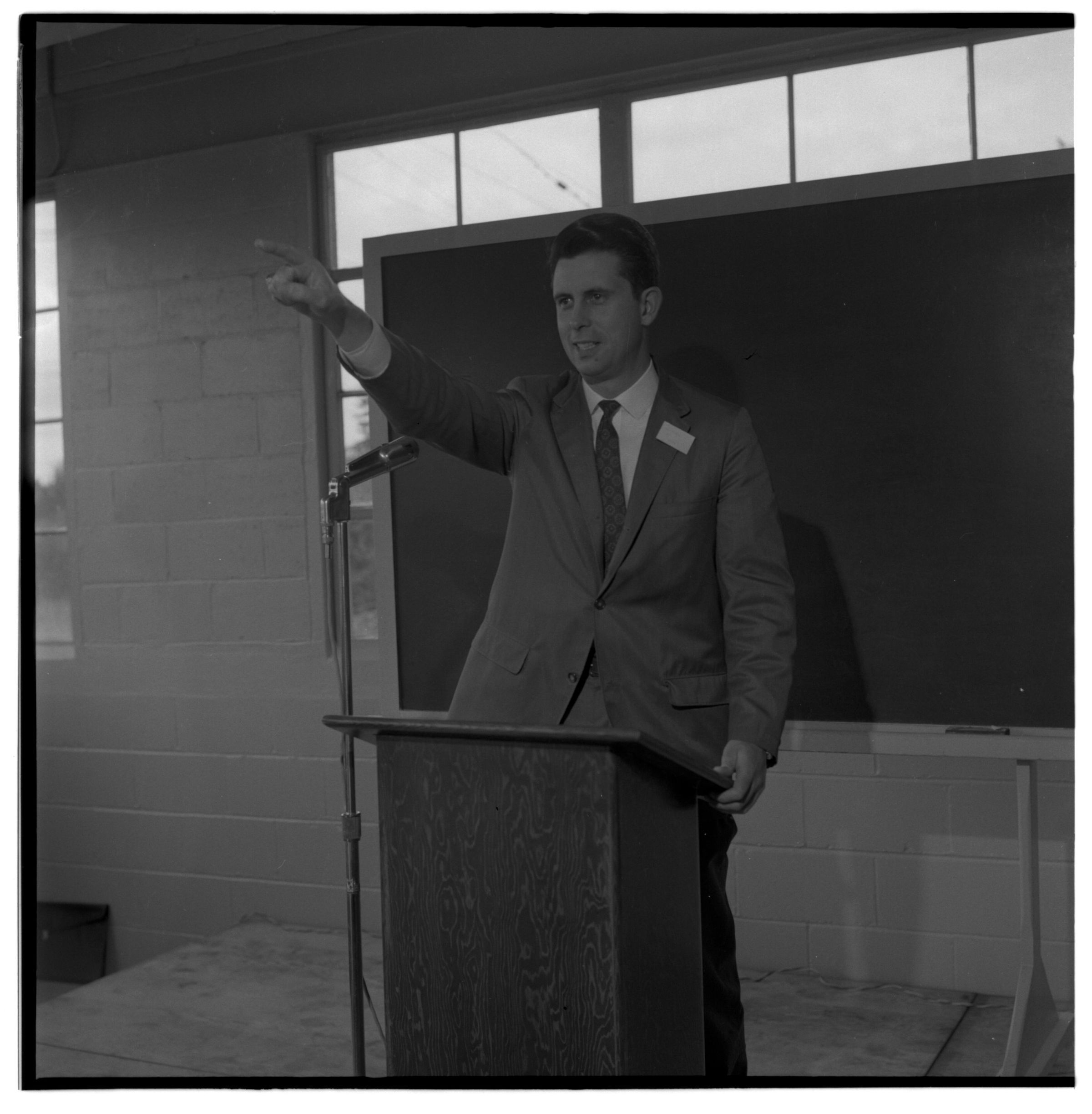 Negative, sheet film. 2 x 2 b&w. Professional associations. Unidentified man in front of chalkboard. Possibly a meeting of National Association of Practical Refrigerating Engineers, held at Olympia brewery.Name/Title