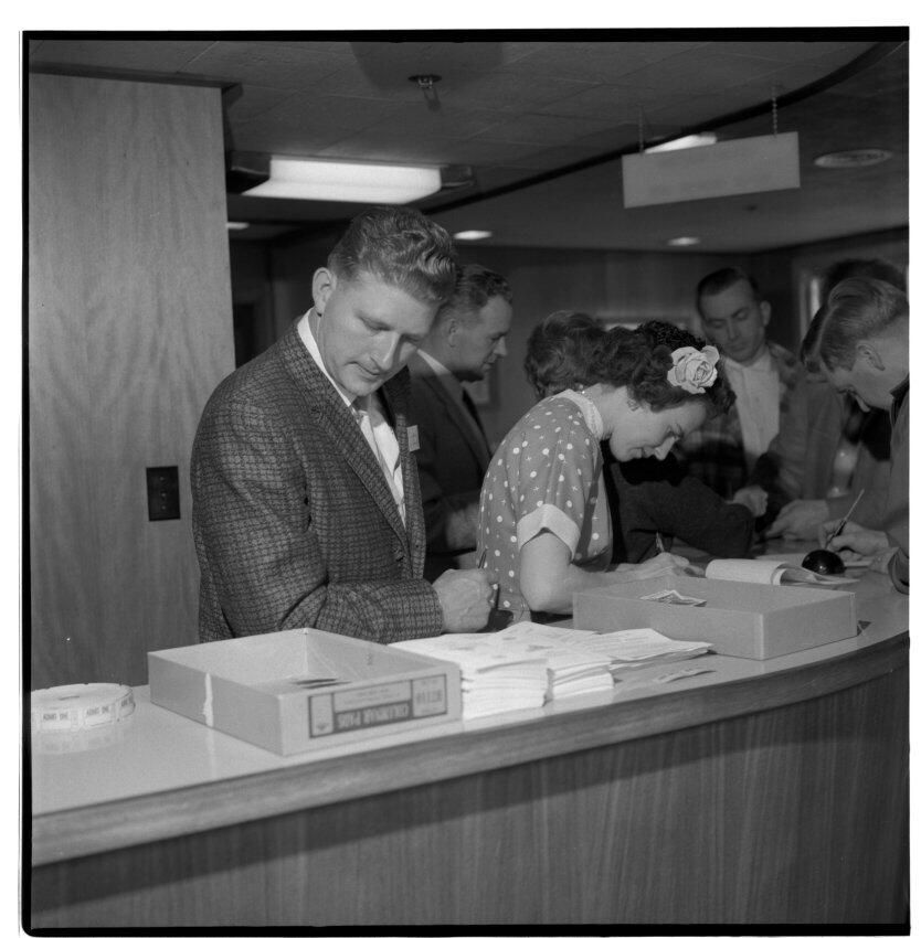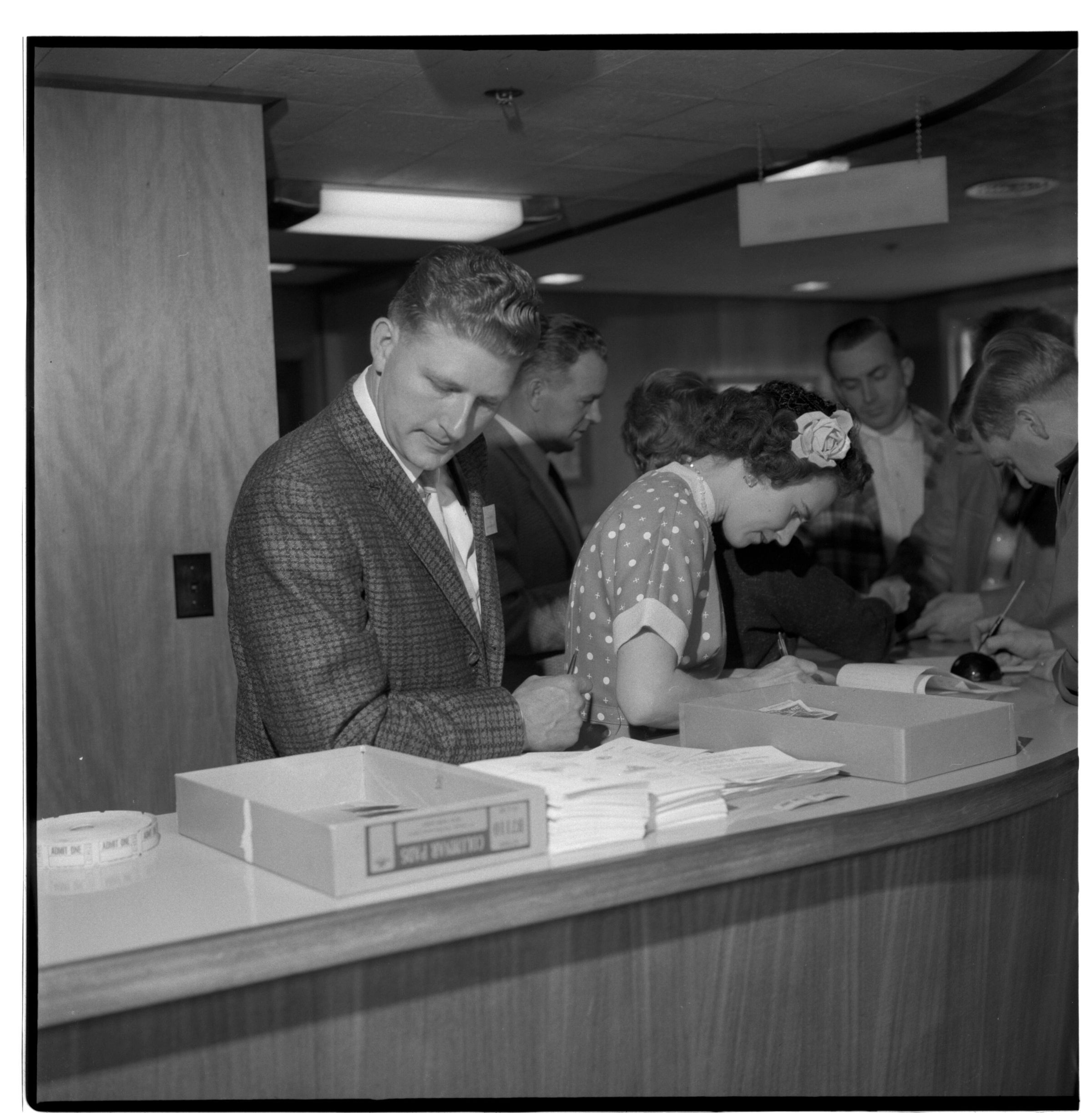 Negative, sheet film. 2 x 2 b&w. Professional associations. Reception desk in hospitality room at Olympia brewery. No ID on people.