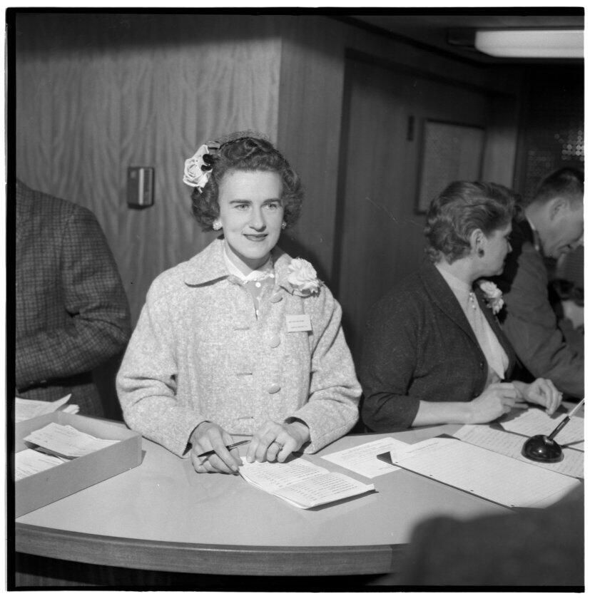 Negative, sheet film. 2 x 2 b&w. Professional associations. Reception desk in hospitality room at Olympia brewery. No ID on people.
