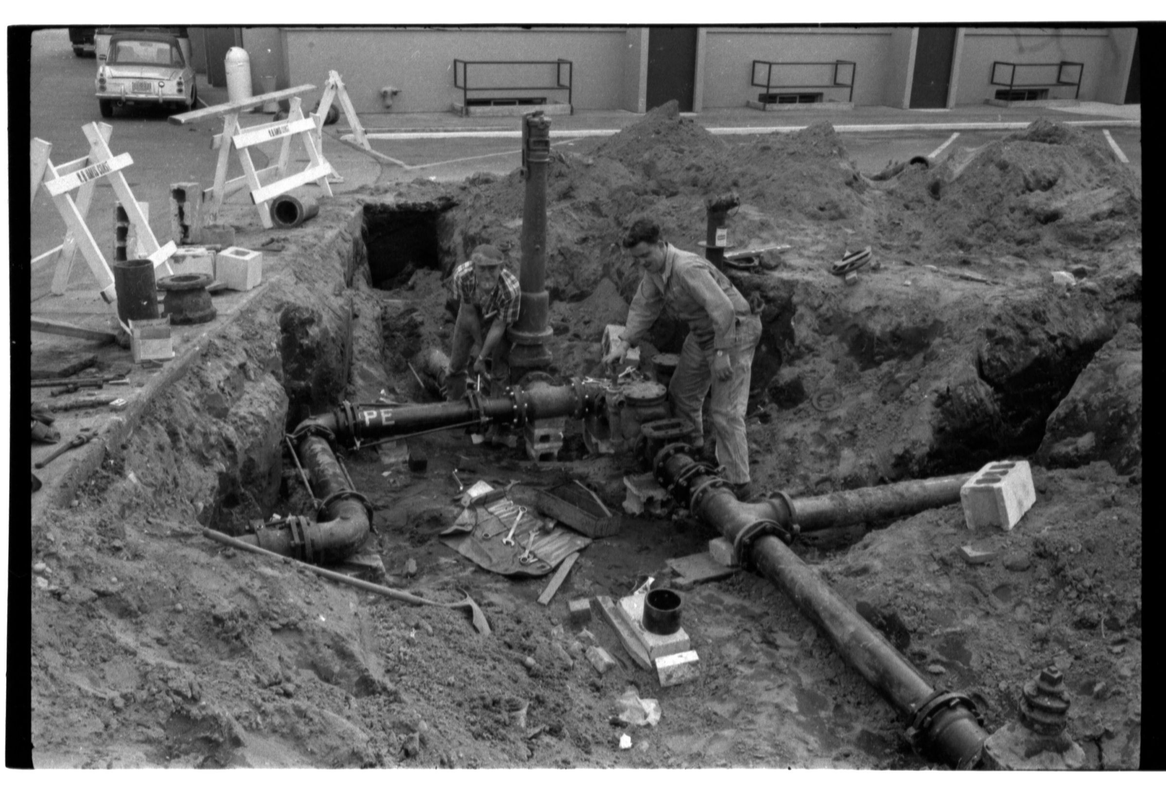 Negative, sheet film. 1 x 1.5 b&w. Plumbing under Custer Way.