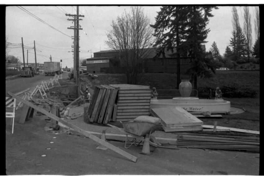 Negative, sheet film. 1 x 1.5 b&w. Railroad tunnel under Custer Way. Fountain at right.