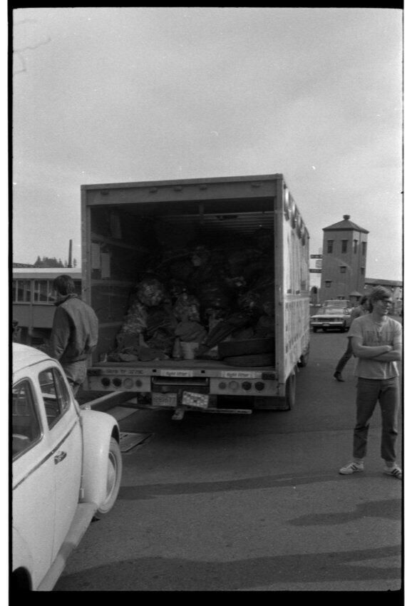 Negative, sheet film. 1.5 x 1 b&w. WSU Delta Tau Delta group brings truck to Olympia brewery to promote recycling. No ID on people.