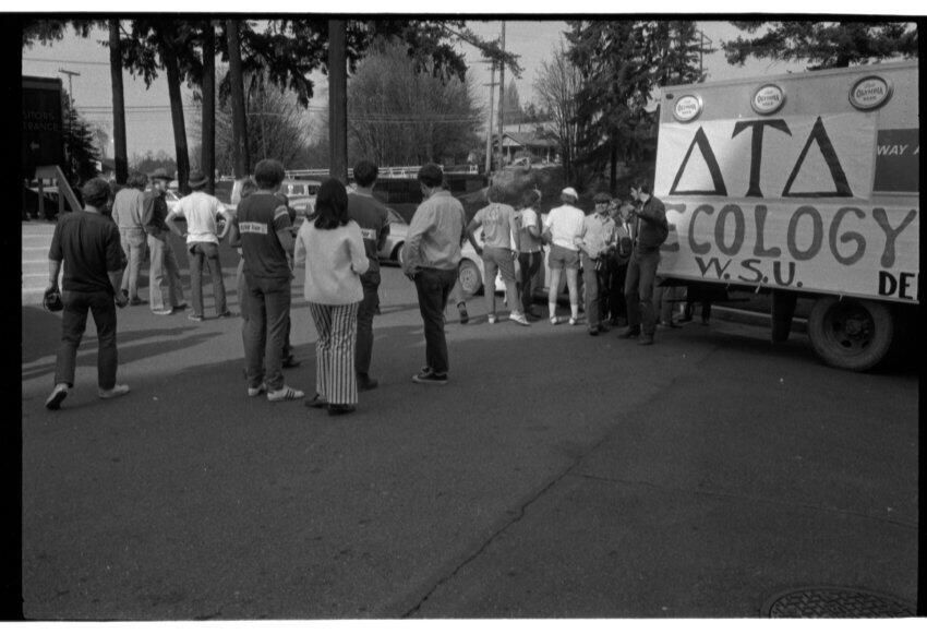 Negative, sheet film. 1 x 1.5 b&w. WSU Delta Tau Delta group brings truck to Olympia brewery to promote recycling. No ID on people.