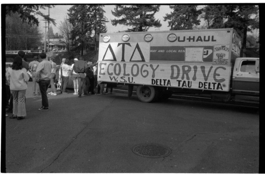 Negative, sheet film. 1 x 1.5 b&w. WSU Delta Tau Delta group brings truck to Olympia brewery to promote recycling. No ID on people.