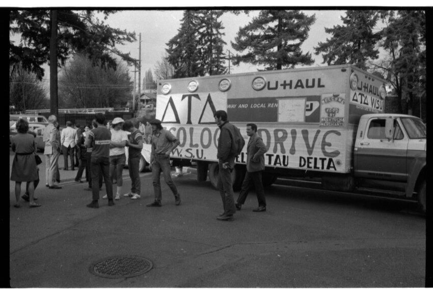 Negative, sheet film. 1 x 1.5 b&w. WSU Delta Tau Delta group brings truck to Olympia brewery to promote recycling. No ID on people.